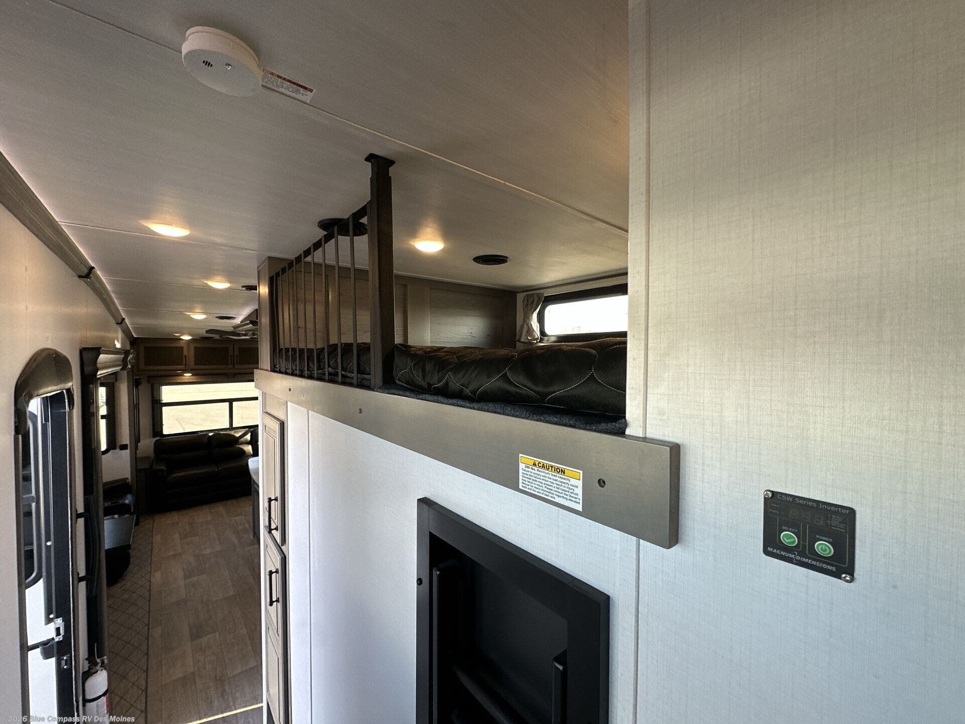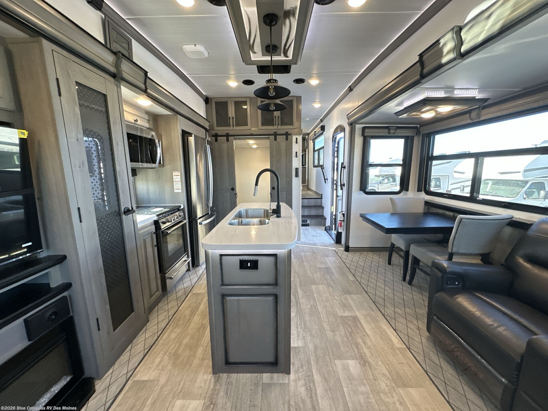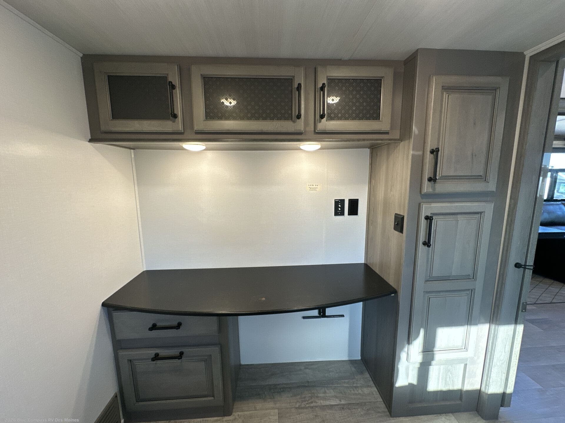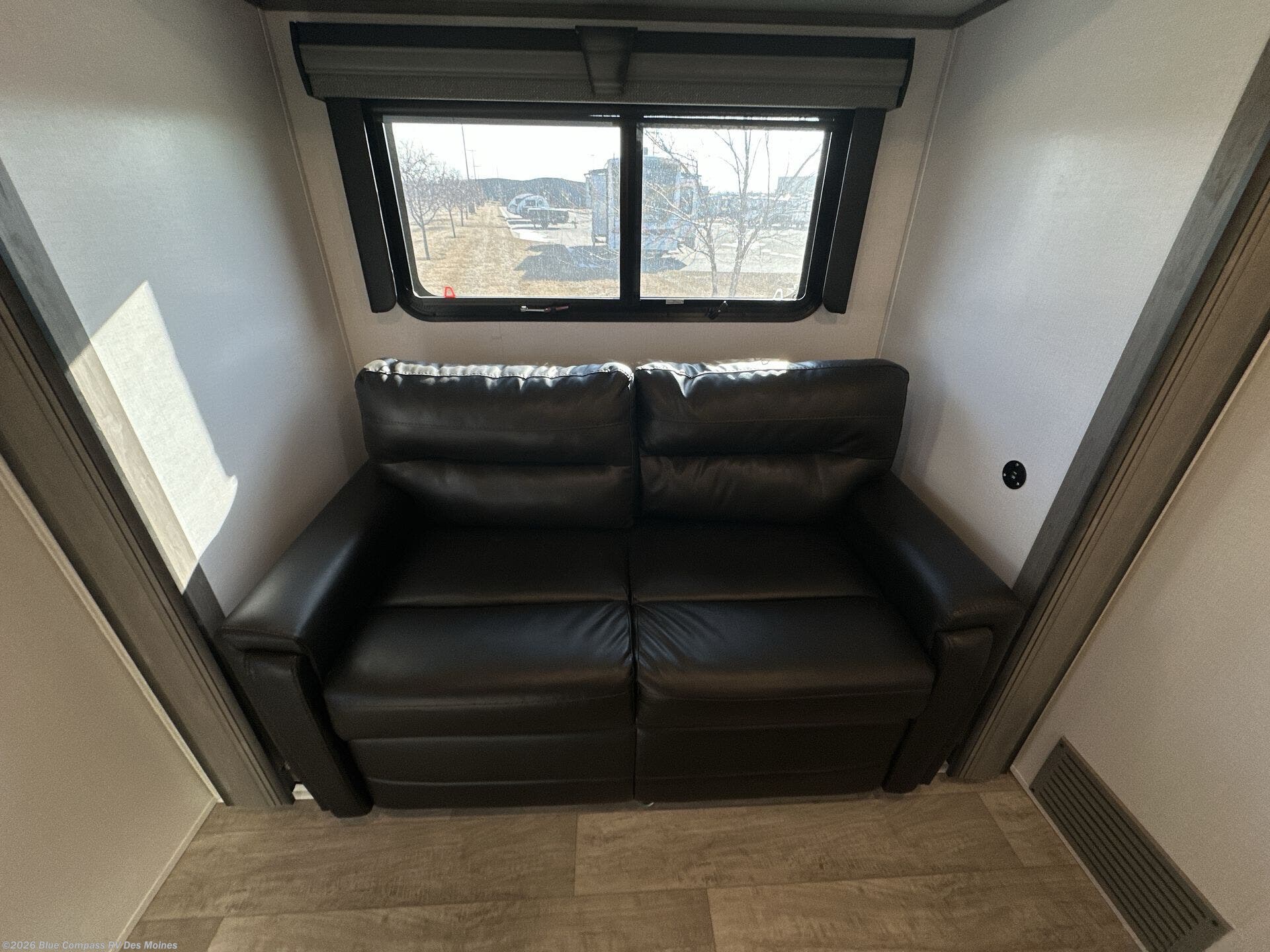 Everyone will have a comfortable place to sleep with two bedrooms in this fifth wheel! The front private bedroom has a king bed slide with storage underneath, a dresser with a 32" LCD HDTV, and a large front closet with a clothing hamper and an area prepped to add the optional stackable washer and dryer. The bonus room has a hide-a-bed sofa across from a desk so you can get some work done while you're away, plus a loft area/attic space above it all with a ladder to access it. The full bathroom has a 48" x 30" fiberglass shower with a seat and skylight above and a linen closet to keep your towels close. The chef can prepare delicious home cooked meals for everyone either indoors with the glass top range or at the outdoor kitchen with a two burner cooktop and refrigerator to keep your drink nice and cold!