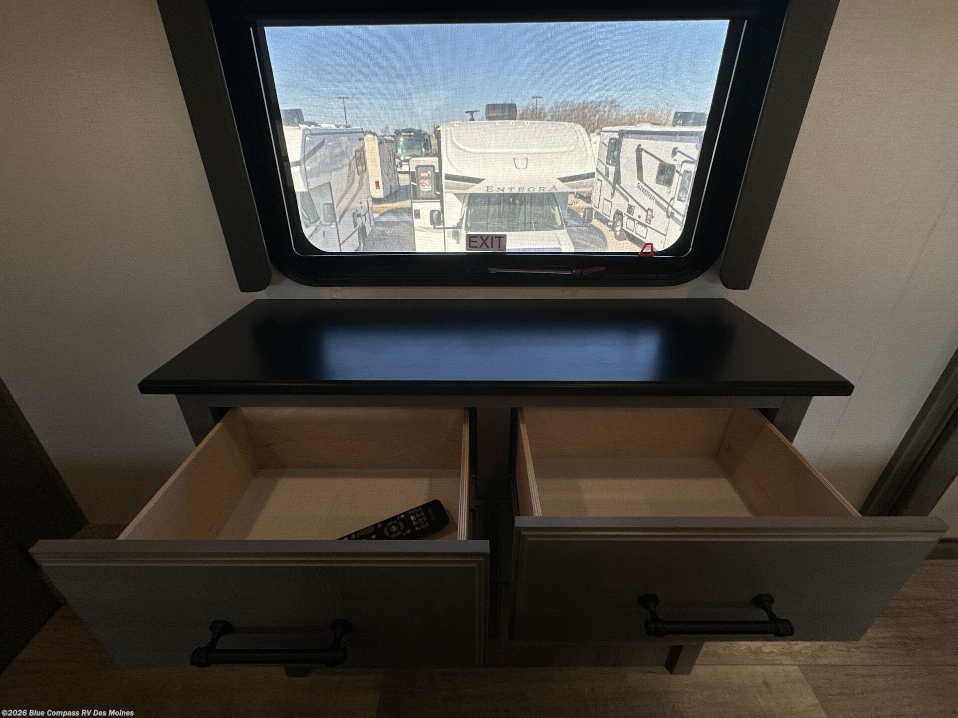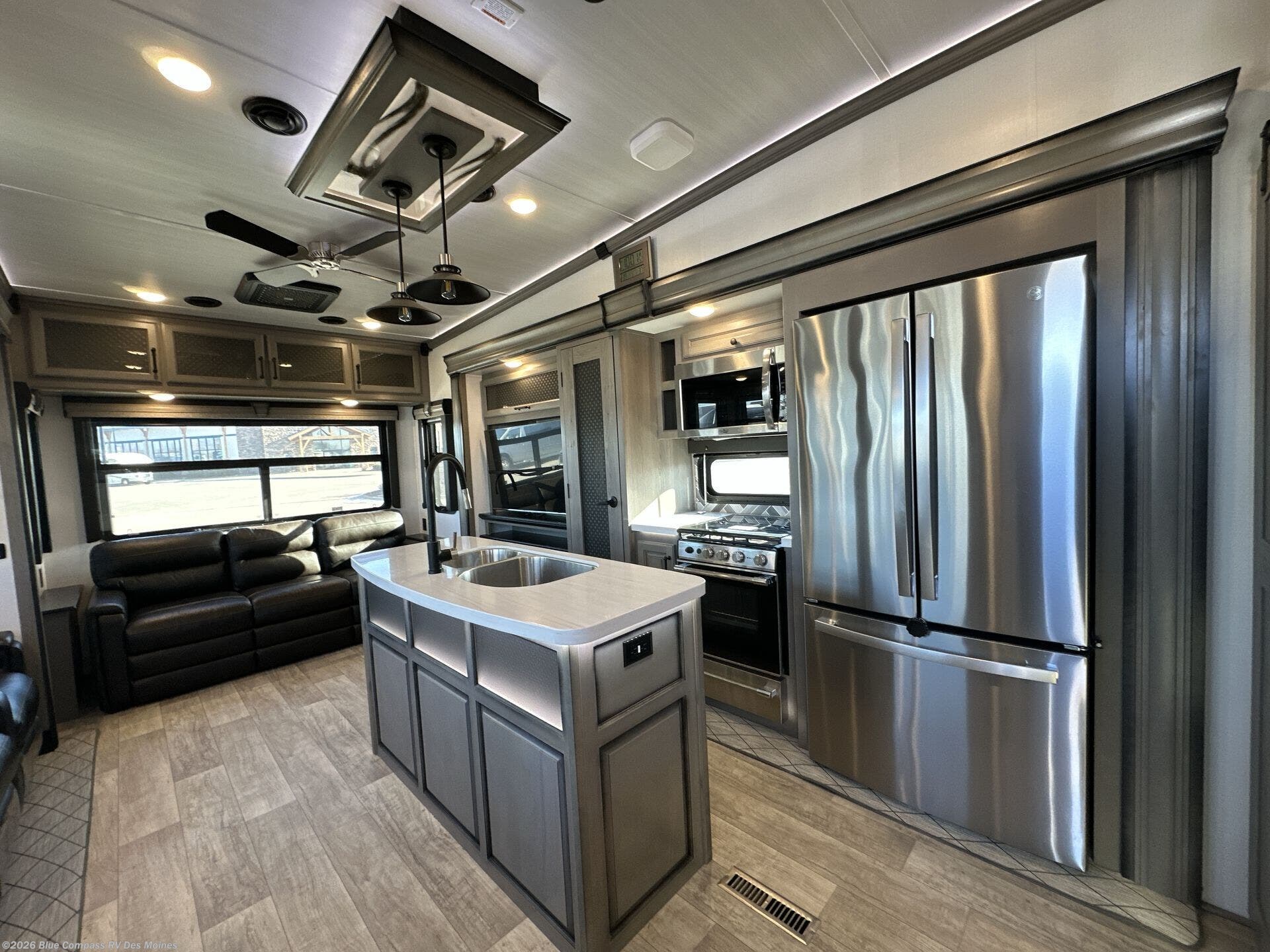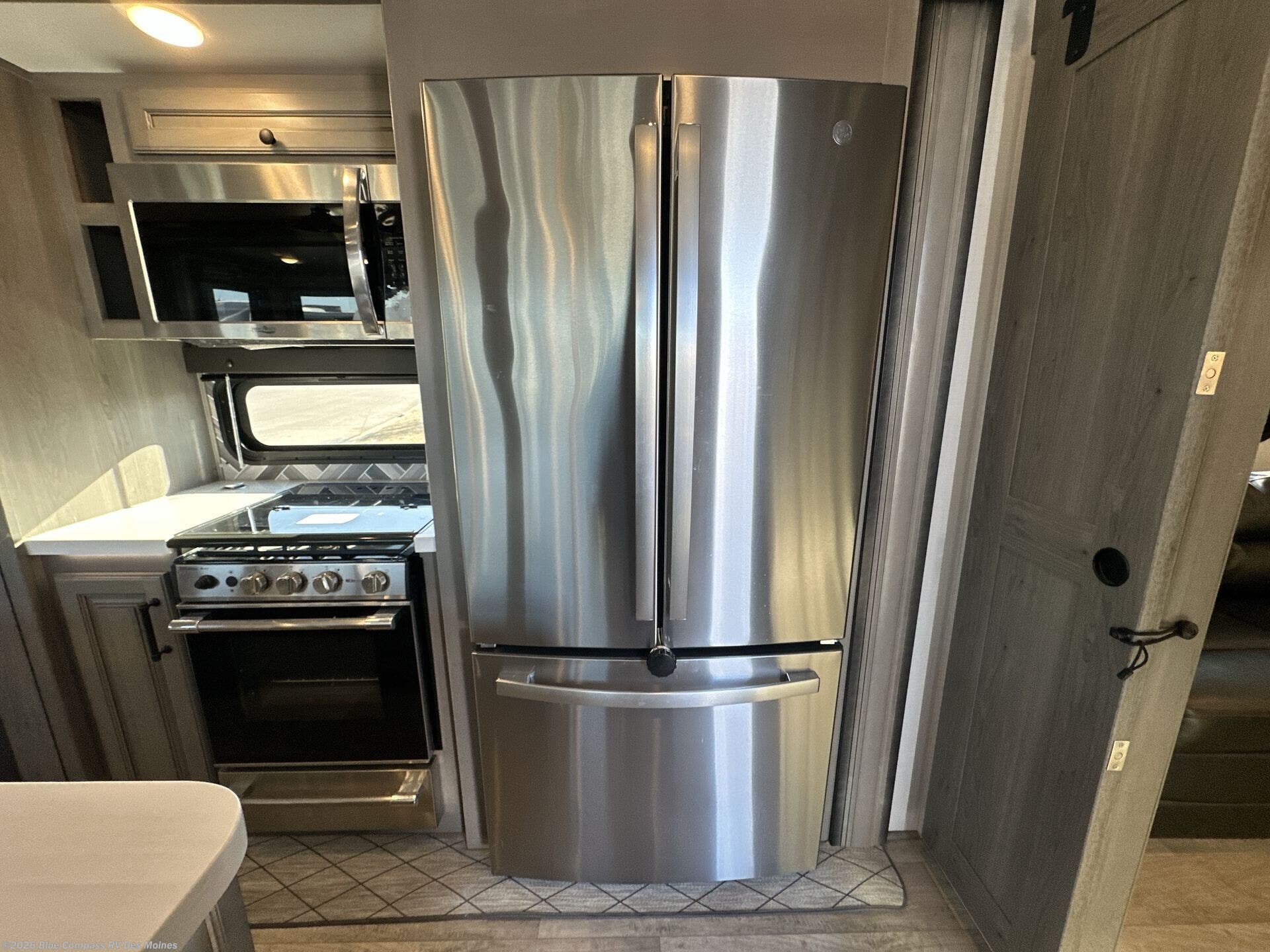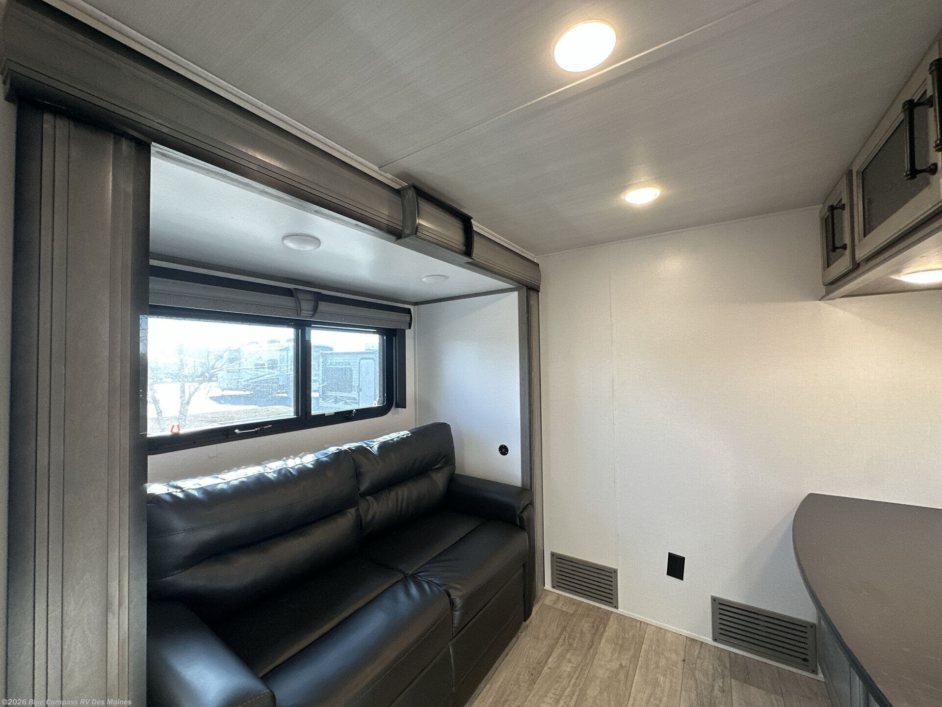 Everyone will have a comfortable place to sleep with two bedrooms in this fifth wheel! The front private bedroom has a king bed slide with storage underneath, a dresser with a 32" LCD HDTV, and a large front closet with a clothing hamper and an area prepped to add the optional stackable washer and dryer. The bonus room has a hide-a-bed sofa across from a desk so you can get some work done while you're away, plus a loft area/attic space above it all with a ladder to access it. The full bathroom has a 48" x 30" fiberglass shower with a seat and skylight above and a linen closet to keep your towels close. The chef can prepare delicious home cooked meals for everyone either indoors with the glass top range or at the outdoor kitchen with a two burner cooktop and refrigerator to keep your drink nice and cold!