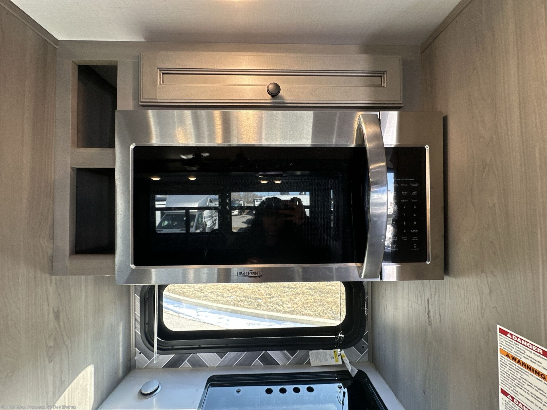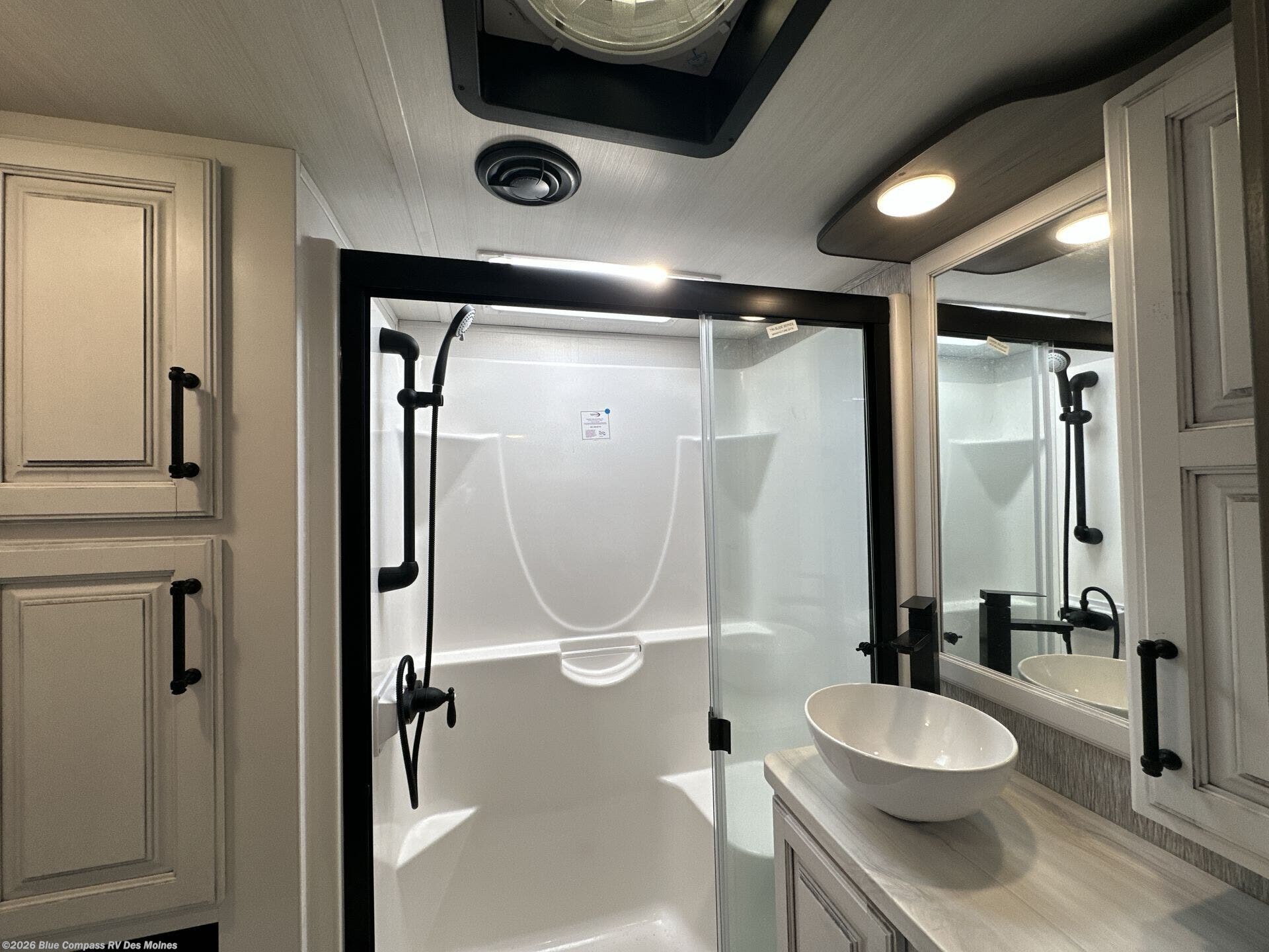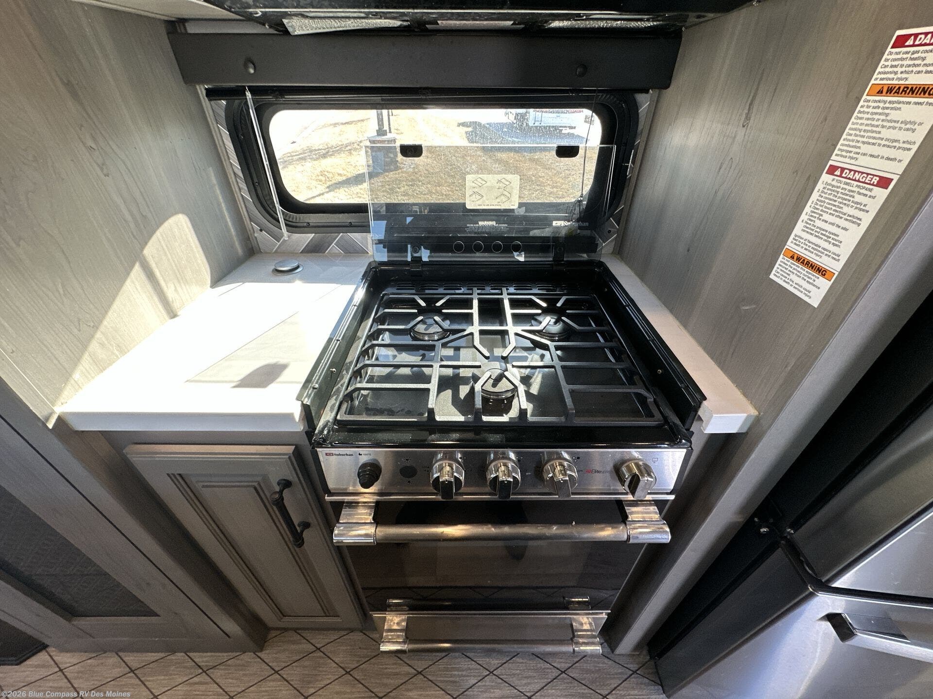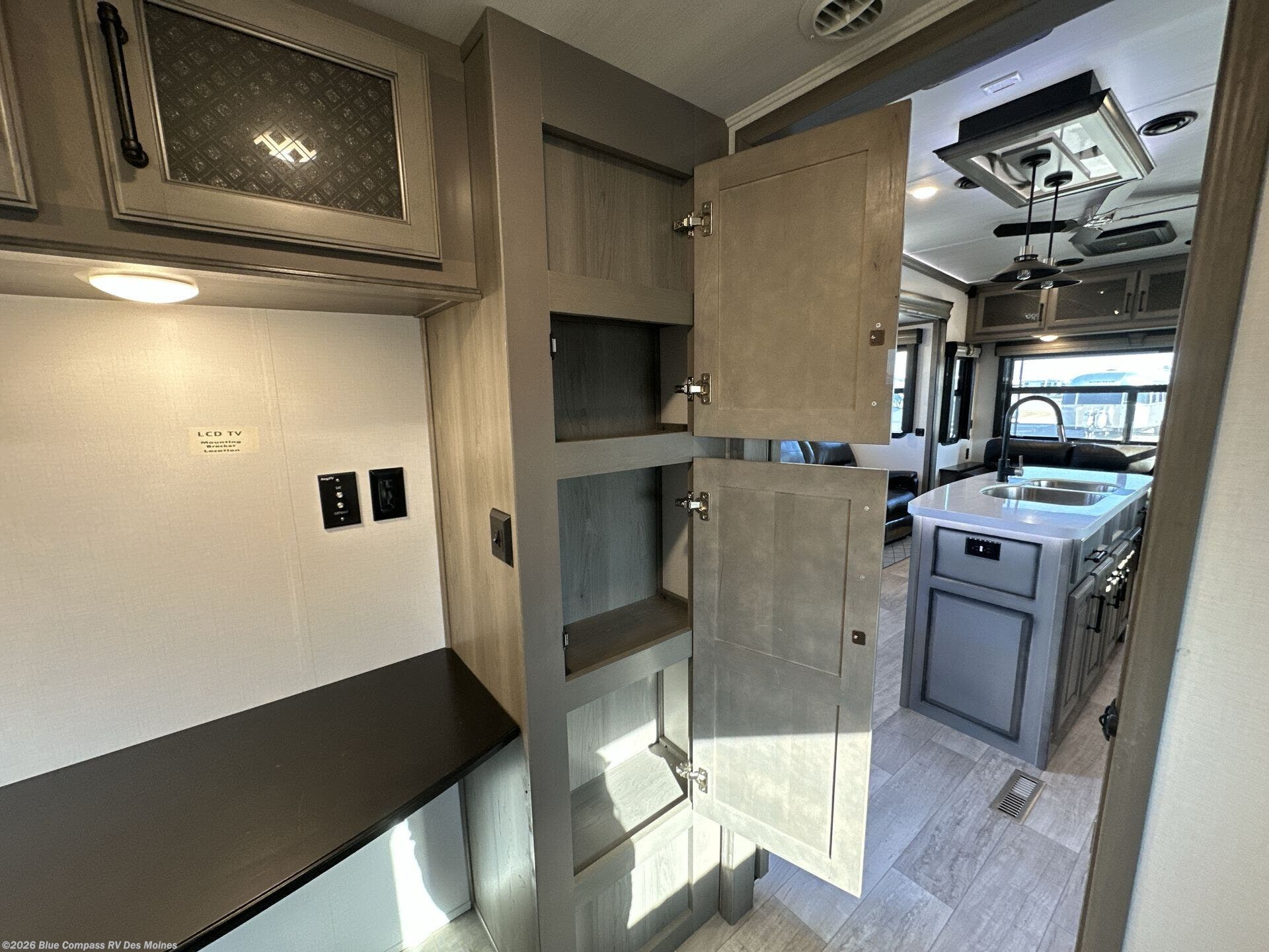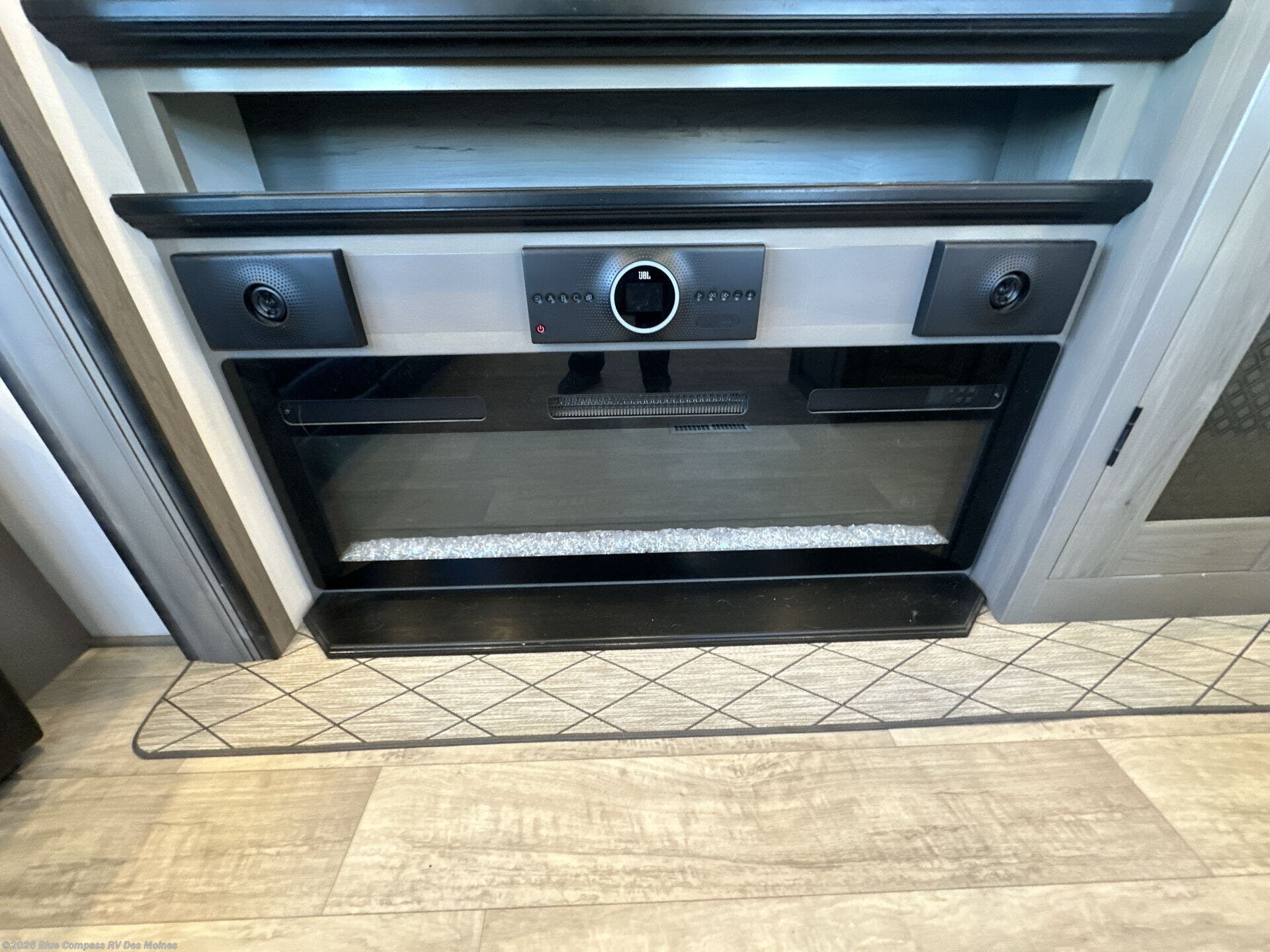 Everyone will have a comfortable place to sleep with two bedrooms in this fifth wheel! The front private bedroom has a king bed slide with storage underneath, a dresser with a 32" LCD HDTV, and a large front closet with a clothing hamper and an area prepped to add the optional stackable washer and dryer. The bonus room has a hide-a-bed sofa across from a desk so you can get some work done while you're away, plus a loft area/attic space above it all with a ladder to access it. The full bathroom has a 48" x 30" fiberglass shower with a seat and skylight above and a linen closet to keep your towels close. The chef can prepare delicious home cooked meals for everyone either indoors with the glass top range or at the outdoor kitchen with a two burner cooktop and refrigerator to keep your drink nice and cold!