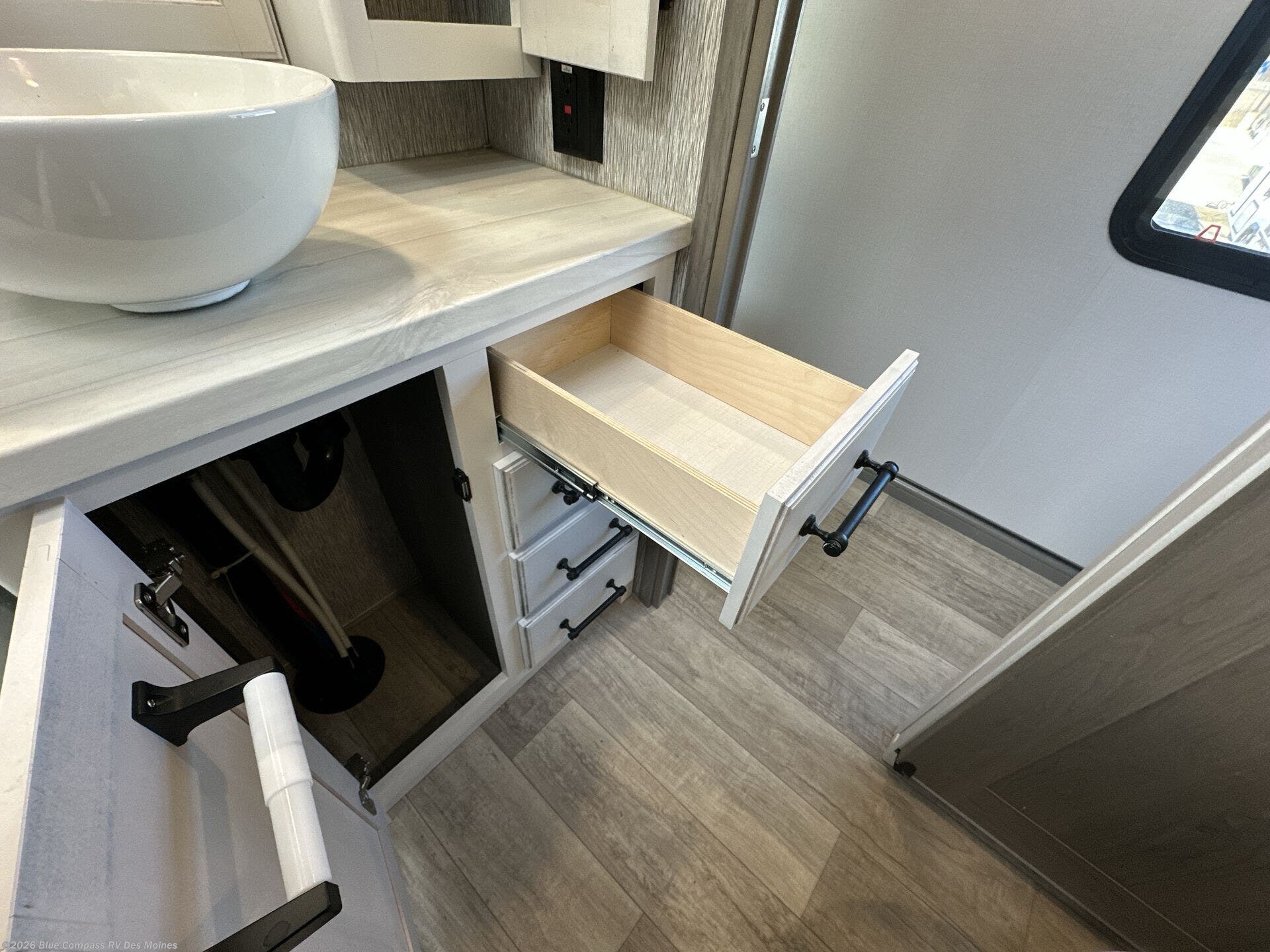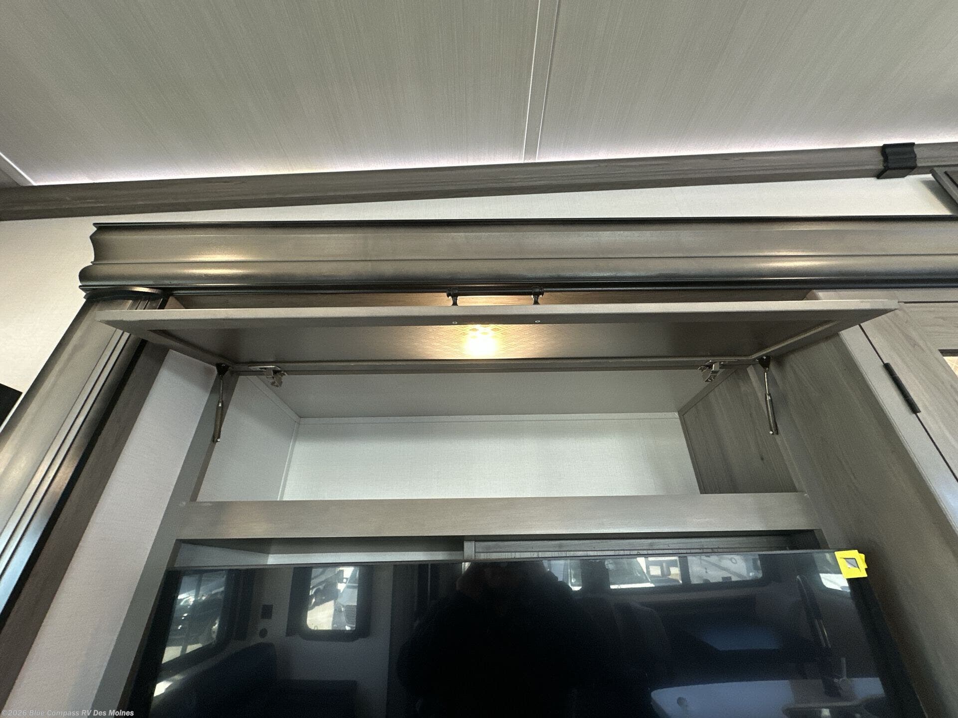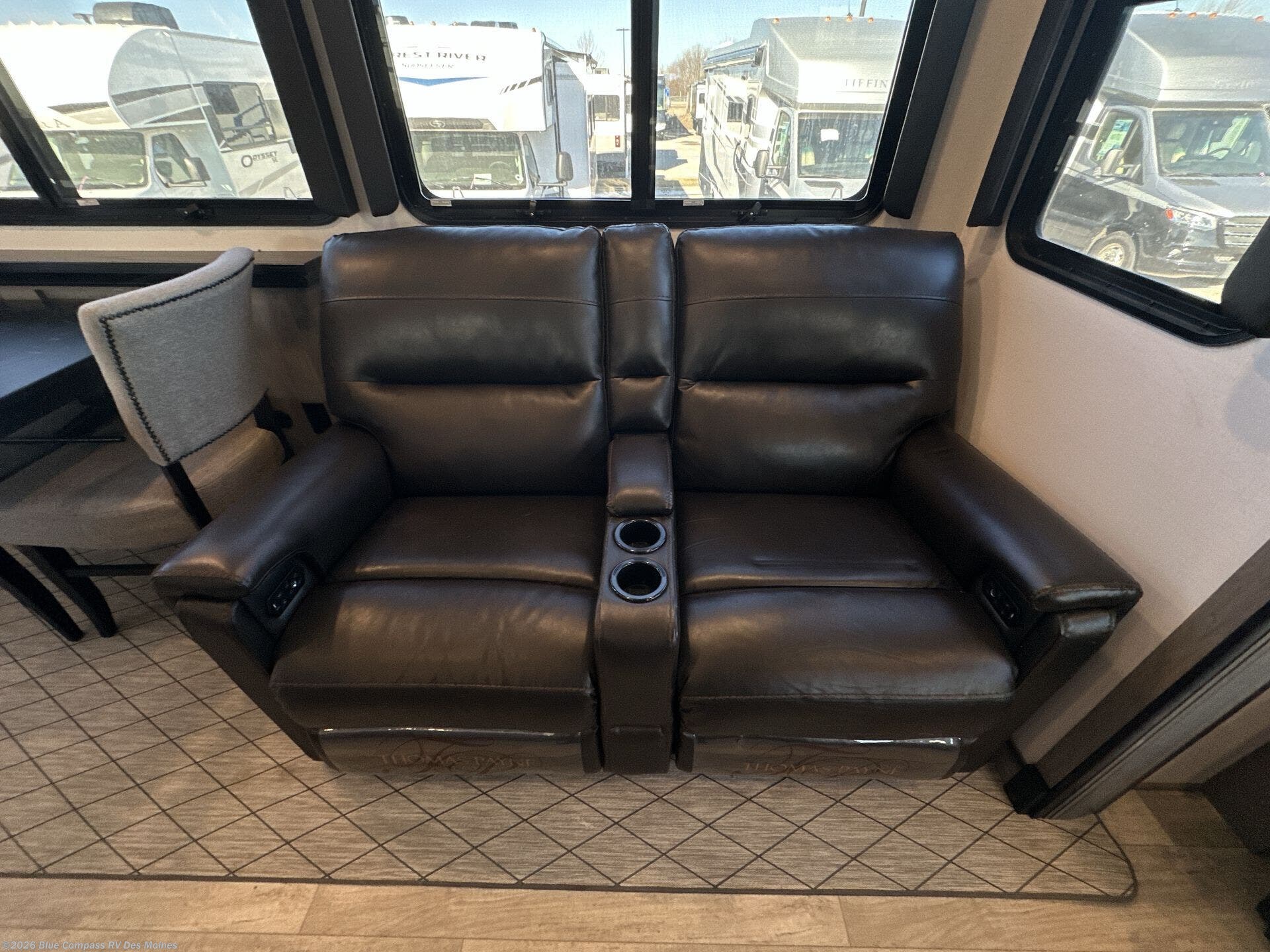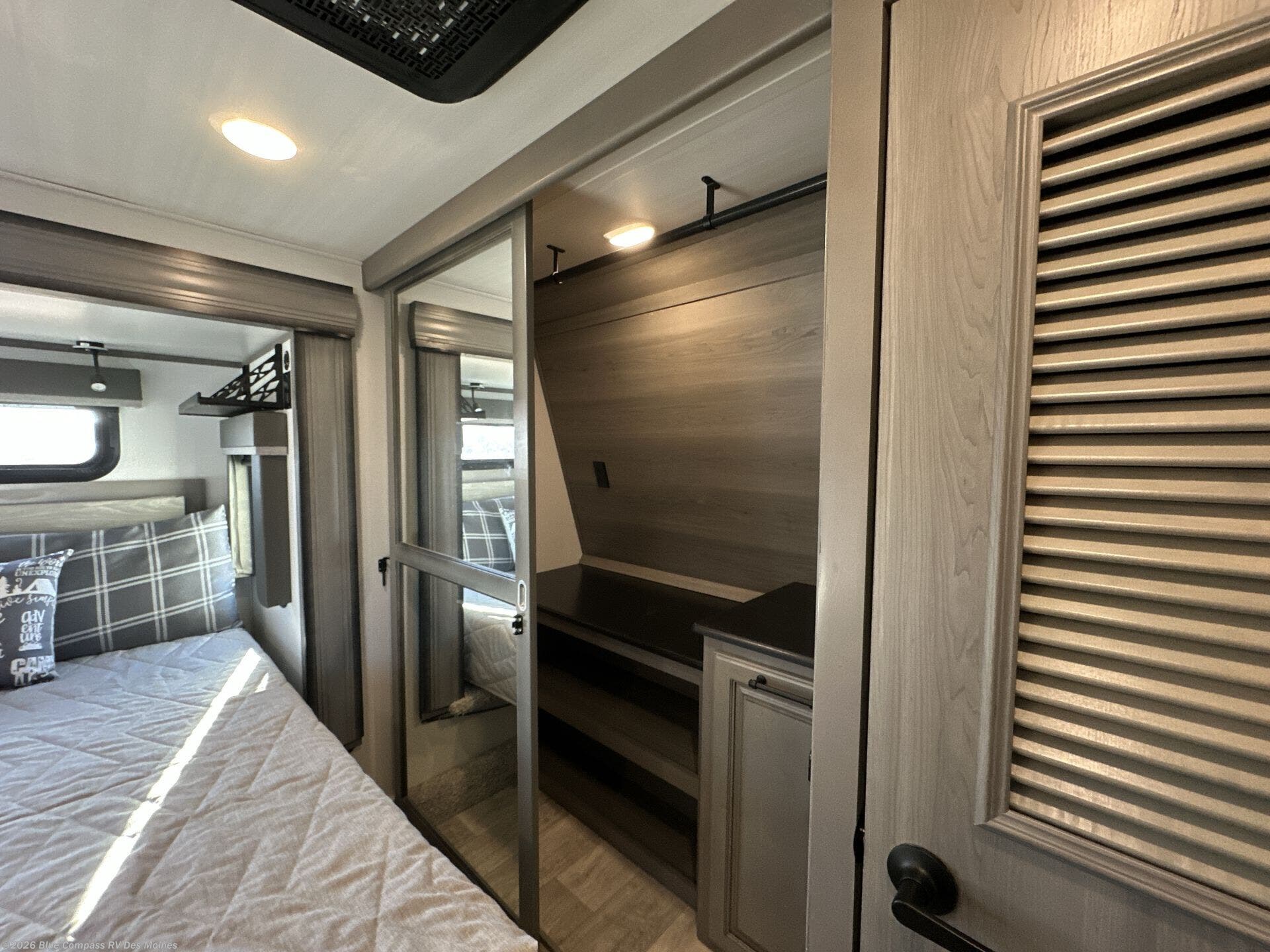 Everyone will have a comfortable place to sleep with two bedrooms in this fifth wheel! The front private bedroom has a king bed slide with storage underneath, a dresser with a 32" LCD HDTV, and a large front closet with a clothing hamper and an area prepped to add the optional stackable washer and dryer. The bonus room has a hide-a-bed sofa across from a desk so you can get some work done while you're away, plus a loft area/attic space above it all with a ladder to access it. The full bathroom has a 48" x 30" fiberglass shower with a seat and skylight above and a linen closet to keep your towels close. The chef can prepare delicious home cooked meals for everyone either indoors with the glass top range or at the outdoor kitchen with a two burner cooktop and refrigerator to keep your drink nice and cold!