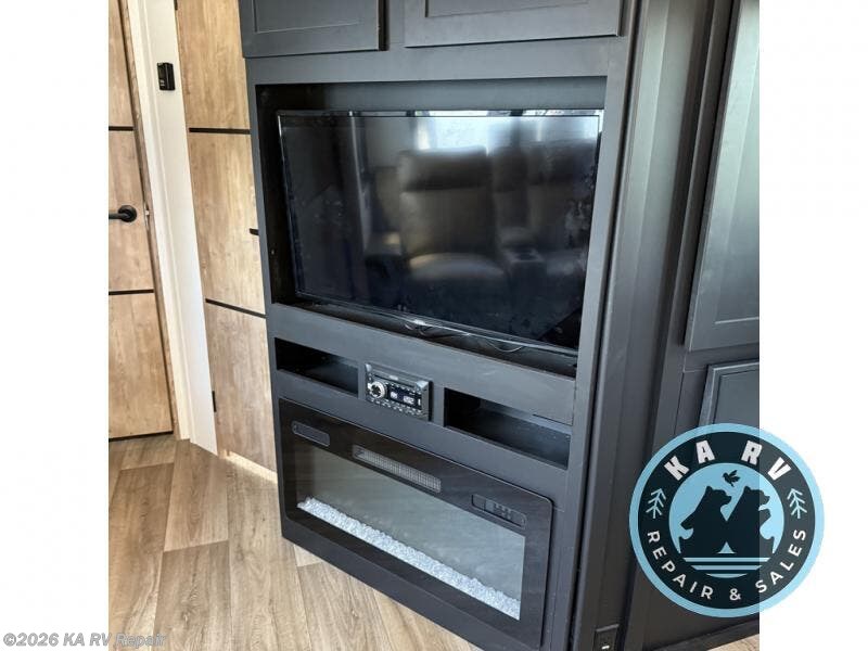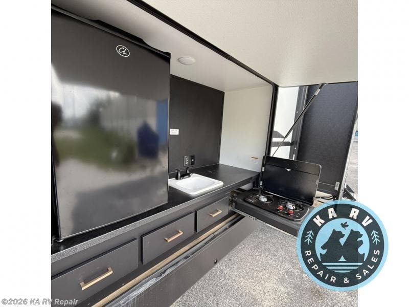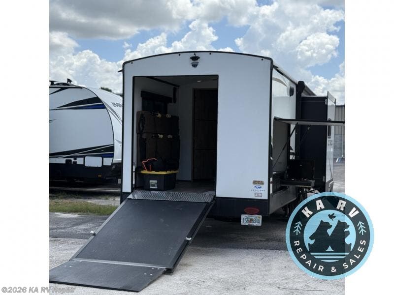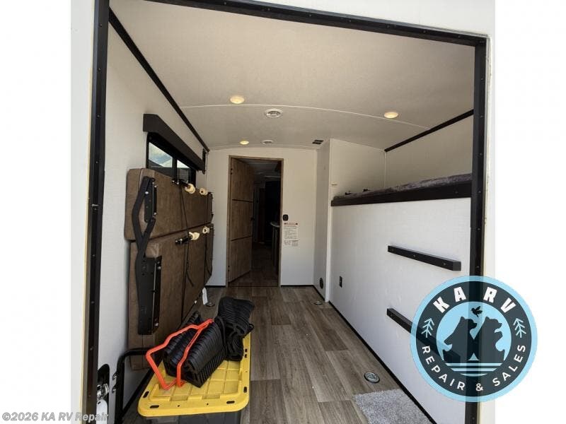 Looking to enjoy some off-road fun with your toys at an RV park that allows you to park your trailer? Then load up the rear 56" ramp door with extension into 8'4" of cargo space that once unloaded, someone can enjoy sleeping on a bunk above an entertainment center and a flip sofa sleeper. The main living and kitchen area offers two slides for more interior space, a kitchen island with skylight above, plus a pantry, a booth dinette and sofa sleeper, and a fireplace with 40" HDTV above for inside entertainment. The cook will have an outside kitchen to whip up some meals while others enjoy the 21' awning. You will find plenty of storage throughout including in the wardrobe slide in the bedroom, and there is a built-in pet kennel for your family's best friend.