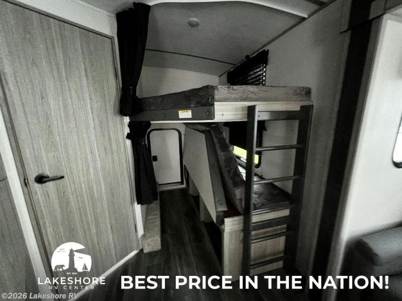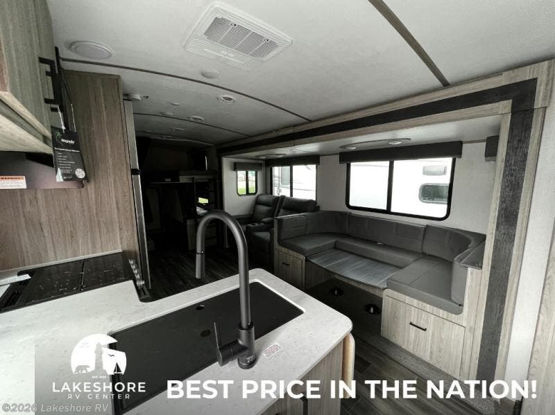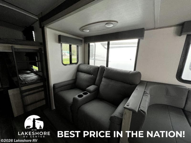 With dual entry doors, you can easily enter and exit this travel trailer! One of the entrances even leads directly into the rear corner bathroom so you can get back to having fun outdoors fast. The set of 51" x 74" bunk beds has a flip-up bottom bunk for storage space and a ladder to safely reach the top. The tri-fold sofa sleeper and U-shaped dinette slide opens up the living/kitchen area and they can be switched out for the optional pivot furniture which can flip back and forth for a dinette or sofa position. Create delicious home cooked meals with the three burner cooktop and flip-up countertop or head to the outside kitchen to breathe in some fresh air while cooking dinner. The exterior also has front pass-through storage, a rear exterior storage area, a cargo door, and a 21' power awning to protect you rain or shine!