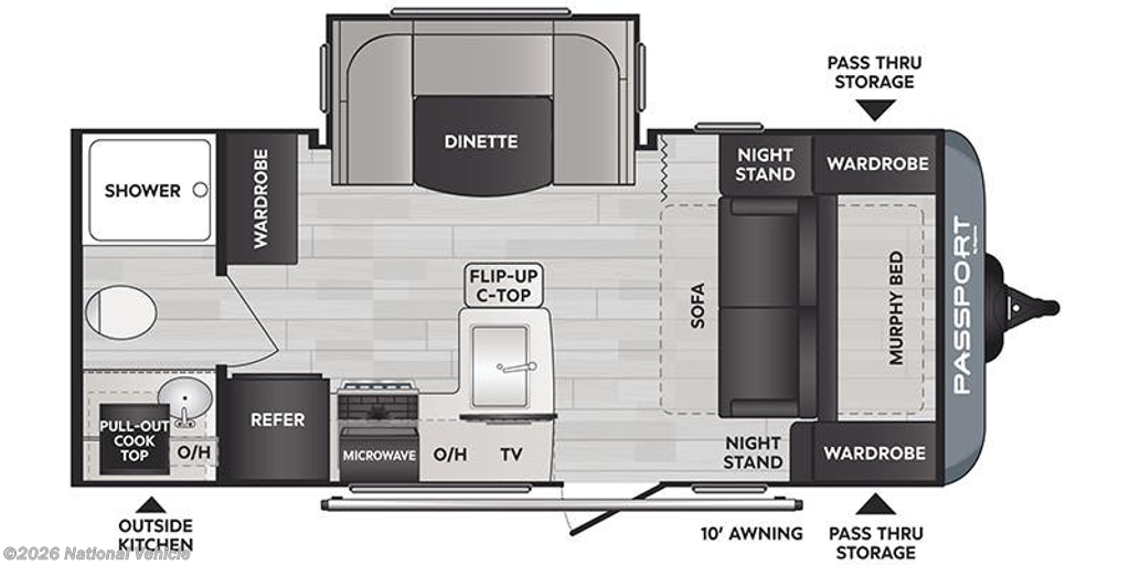 This Passport SL travel trailer is your ticket to paradise! It has a functional living space since both the U-shaped dinette and Murphy bed can reposition whenever needed, and when you put away the Murphy bed, you'll find that there is a sofa in its place. You could even switch out the dinette for an optional theater dinette. Just outside the rear bathroom is a large wardrobe so that you can keep your toiletries stored close to the bathroom. Not only does this trailer have a full indoor kitchen, but it also offers you an outdoor kitchen with a pull-out cooktop so that you can enjoy some sunshine while you cook.