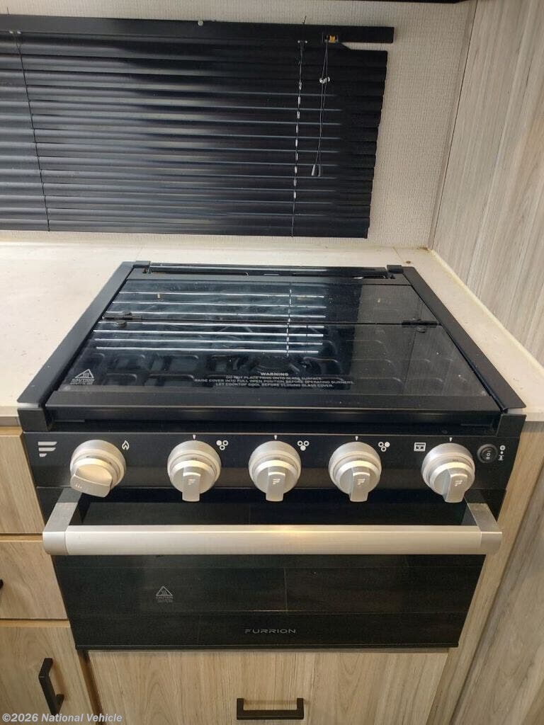 Outside is just as impressive, with a power retractable awning, outdoor kitchen featuring a mini fridge and griddle, outdoor shower, rear cargo door, and a full pass-through storage for all the gear that somehow multiplies on every trip.