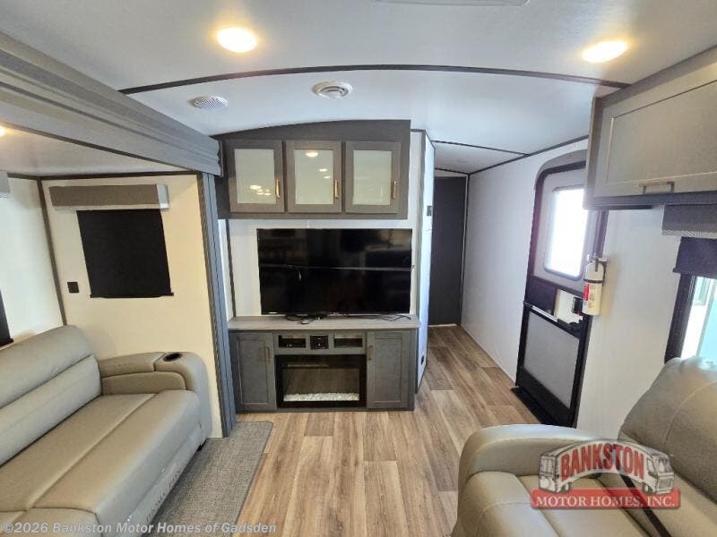 Camp in luxury with this travel trailer! The rear kitchen has plenty of countertop space for you to prepare your meals, a three burner Furrion gas range to fry up some bacon, and a 8 cu. ft. gas/electric refrigerator to keep your perishables fresh. There is even an outside kitchen with a two burner cooktop, a mini refrigerator, a sink, and an overhead cabinet all protected by the 21' electric awning. Enjoy your meals at the dream dinette and relax in either one of the two recliners or on the 68" tri-fold sofa while your stomach settles. The entertainment center has an electric fireplace and a LCD TV for you to watch your favorite movies. When you're ready to wind down your night, take a relaxing shower in the 36" tub/shower and then lay down on the queen bed in the front private bedroom!