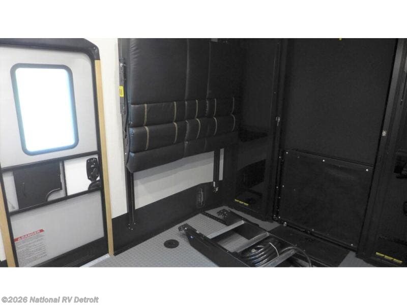 You won't believe all that this toy hauler has to offer! Starting with the dual entry doors, one of which leads into the 11' garage area with an electric bed above dual opposing sofas with table in between, a loft with twin bed, and an area prepped to add an optional washer and dryer. The chef can prepare their best home cooked meals with the three burner cooktop and store everyone's favorite snacks in the two pantries. Relax in the 3-seat recliner across from the pop-up TV and fireplace for a cozy evening indoors or head to the outside entertainment center with a TV and mini refrigerator. The dual entry bathroom makes it easy for everyone to access especially those staying in the front private bedroom which has a residential queen bed that can be switched out for an optional Raptor king bed, wireless phone chargers on either side of the bed, and a wardrobe slide to keep your clothes looking nice!