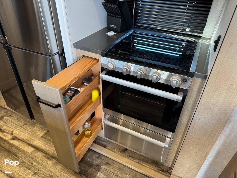 The living area/kitchen boasts a 4-seat recliner, an entertainment center with a fireplace, an island kitchen with solid surface counters, a huge residential refrigerator with a freezer, a convection microwave, a conventional oven, and three three-burner stove top.