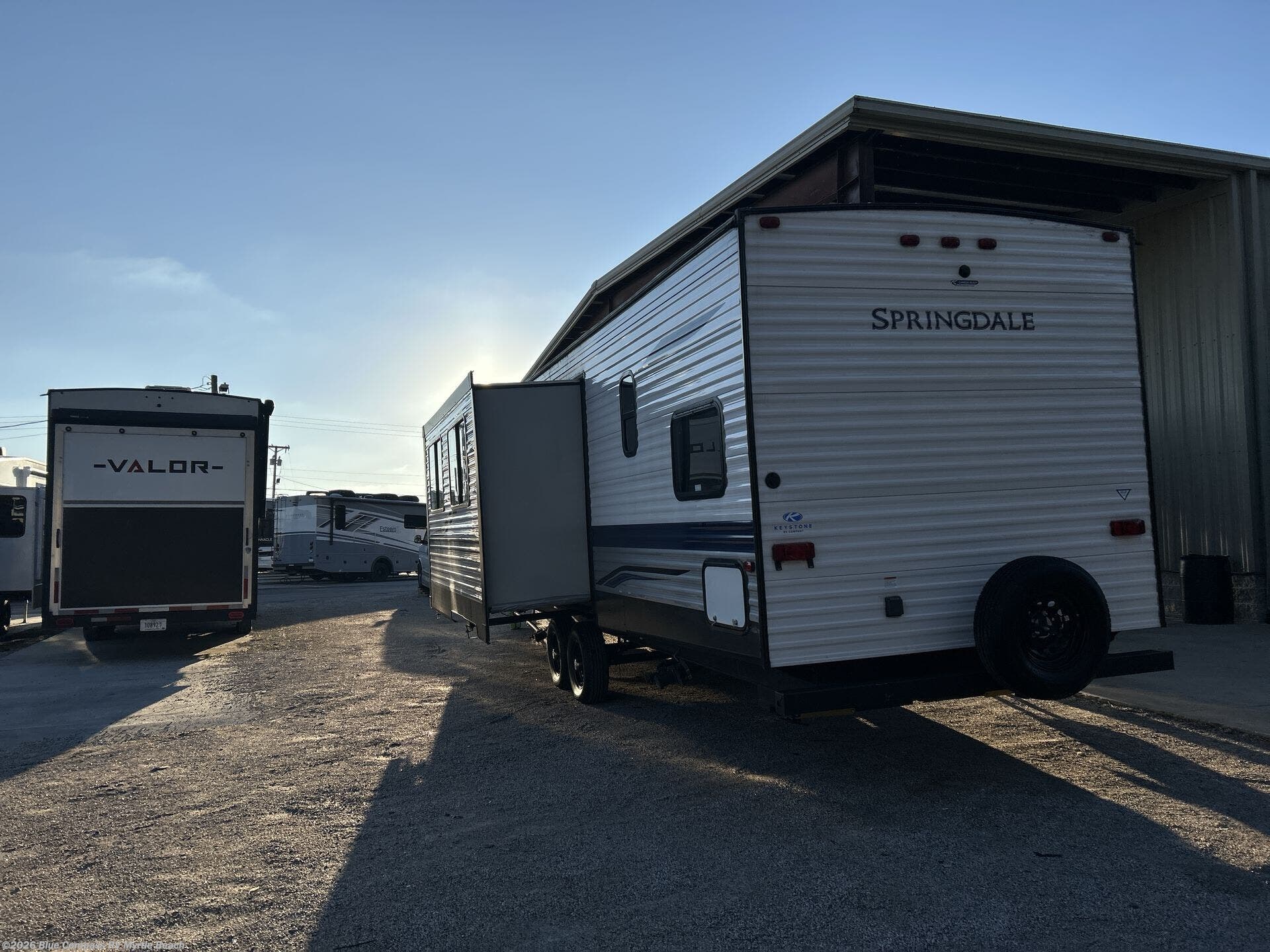 Every weekend will be awesome and exciting with this Springdale travel trailer! There are so many conveniences included throughout this trailer, like a private bedroom up front that contains the second exterior entry door, a rear bunkhouse suite that has its own half bathroom, and an outdoor kitchen that allows you to pull double duty when preparing dinner. The interior living area feels lovely and home-like with a fireplace across from the sofa and booth dinette, and you will especially feel right at home when you grab a couple of snacks from the walk-in pantry. You might even like to add a washer/dryer option to the prepped space.