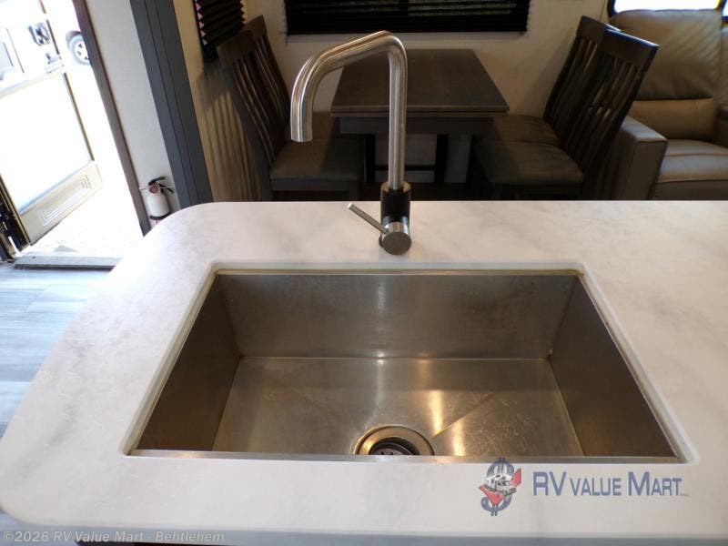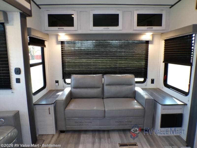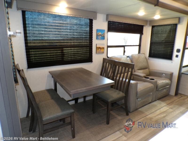 With any Sprinter fifth wheel by Keystone RV, you will have elements of a traditional RV lifestyle, Camping Made Easy features, and more living space, storage and towing stability in this longest-standing brand! The exterior includes a 100" wide-body frame with full width outriggers, MaxTurn technology with Road Armor suspension, Hitch Vision, an automotive-grade painted fiberglass front cap with KeyShield protection, plus the Thermal package and a heated and enclosed underbelly with astro-foil insulation for all-weather camping. There is a wireless remote control for slideouts, lights, awning and more, Thomas Payne theatre seating with USB, lights and massage, plus woven flooring that is highly durable marine-grade flooring for easy cleanup after a fun trip. Make your selection today!