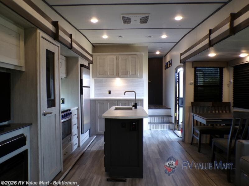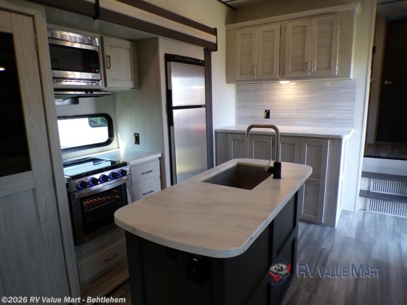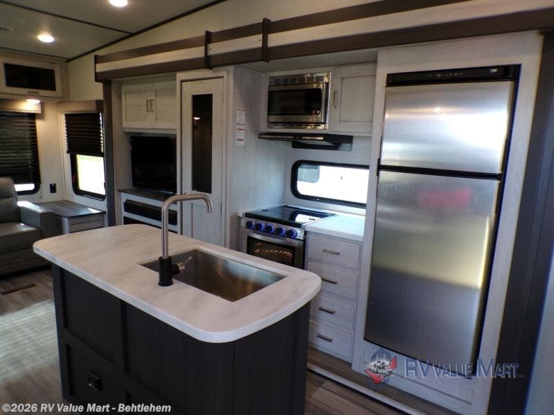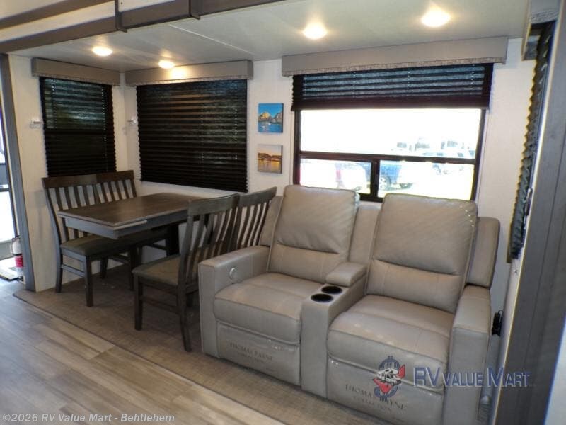 This fifth wheel will be calling your name after a long hike to enjoy the queen-size tri-fold sofa, the full reclining theatre seats with massage, lights and USB charging, and the 40" LED HD TV with fireplace/heater below. When you are rested, you can prepare and cook meals in the full kitchen with a three-burner gas range with a 21" stainless steel oven, a glass top and piezo electronic ignite, plus a stainless steel microwave with carousel, and an 8 cu. ft. refrigerator. The kitchen island and extra prep area will come in handy when making those holiday meals. The front private bedroom offers a residential queen bed, a slide out wardrobe, two nightstands and outlets to keep everything charged. And the double entry bathroom will come in handy, plus the residential shower with a seat will be relaxing. There are many more features including along the exterior such as the central hookup station with hot and cold water hookup, the ladder for roof access, the LP quick connect, the outdoor TV prep and more!
