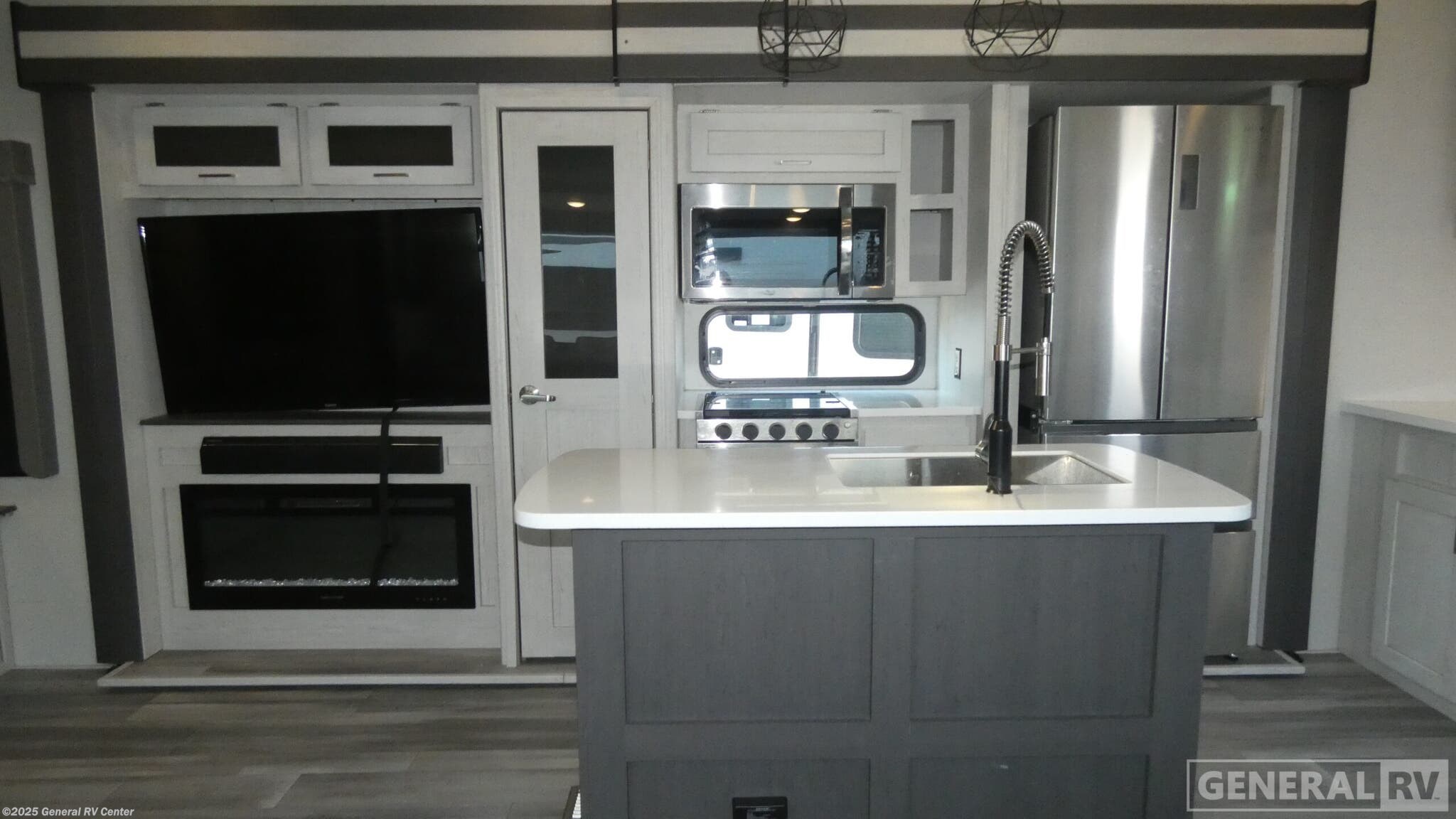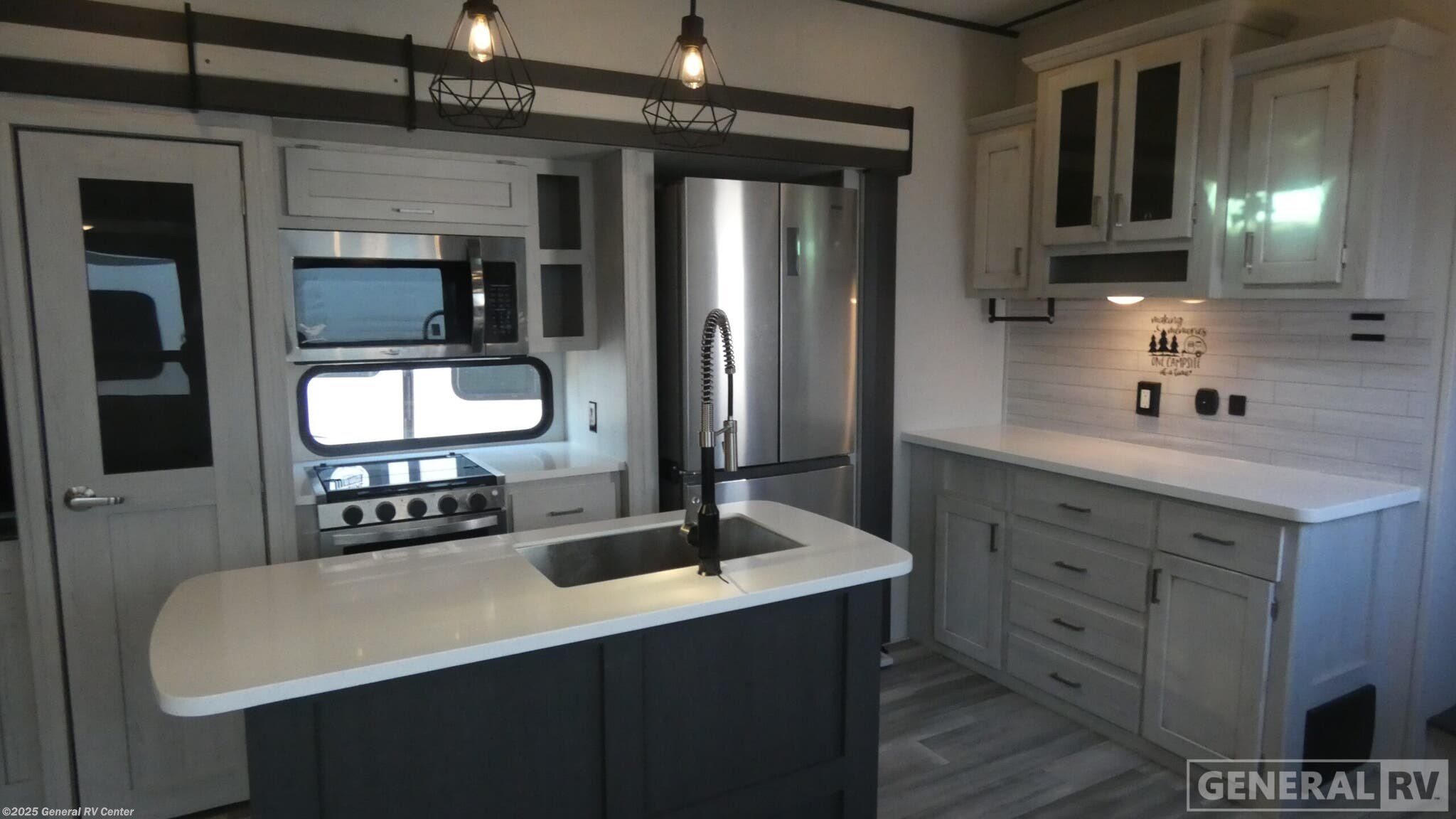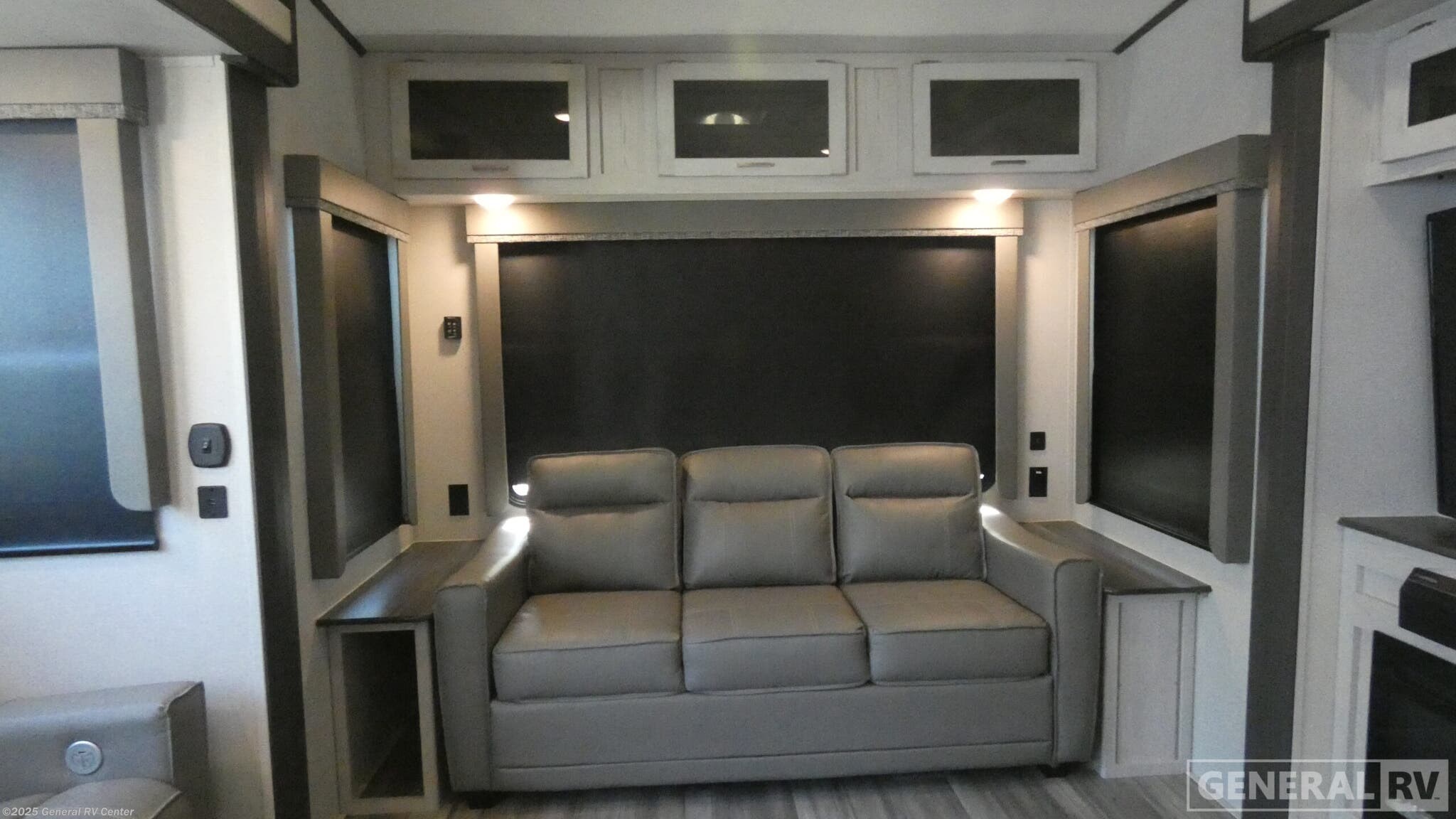Keystone Sprinter Limited fifth wheel 3190RLS highlights: Floor-To-Ceiling Lighted Pantry Huge Entertainment Center Opposing Slides Full-Reclining Theater Seats Kitchen Island Private Bedroom You will spend each night in exceptional comfort on the king-size bed in the front bedroom of this Sprinter Limited fifth wheel! The bedroom offers you a large wardrobe with mirrored doors, a dresser, a slide out, preparations for a TV, and a closet that has been prepped for a washer/dryer. You'll be right next to the bathroom where you will find a residential shower and linen closet for easy morning routines, and when you step into the main living area, you'll be met with a wide-open space. Grab a bowl from the hutch, some cereal from the floor-to-ceiling lighted pantry, and some milk from the 12-cubic foot refrigerator to enjoy breakfast at the wall-mounted dinette with chairs. Or, if you're wanting to stay comfortable, sit on the 72" sofa and use the end tables. Nothing else says "Camping Made Easy" quite like the Keystone Sprinter Limited fifth wheels and travel trailers do! These luxe RVs offer a premium experience that you'll be dying to be a part of. With unmatched technology, comfort, functionality, and quality, it's no wonder the Sprinter Limited is on everyone's wish list. You can stretch out and stay a while with the 100" wide-body frame with full-width outriggers, and the thermal package keeps you comfortable even when the weather is extreme. Some of the deluxe amenities that have been included on the Sprinter Limited are the Thomas Payne luxury collection furniture, crown molding, Congoleum vinyl flooring with one-piece Dyna Span marine-grade decking, solid-surface countertops, a deep single-basin stainless steel industrial sink, and gas struts for under-bed storage. Each model has also been prepped for 4G LTE and Wi-Fi to keep you up-to-date in the modern world.