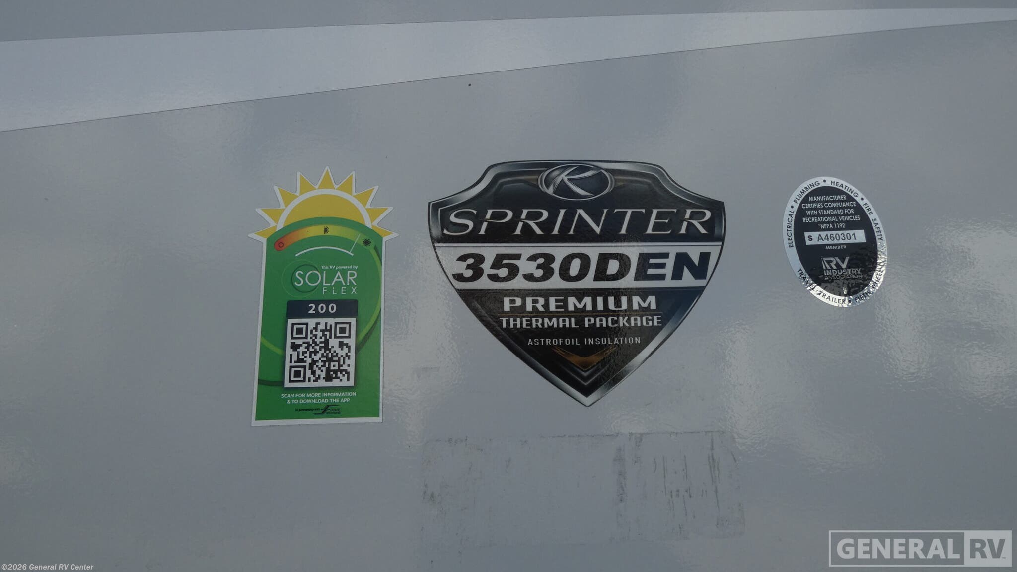 Keystone Sprinter Limited fifth wheel 3530DEN highlights: Front Private Bedroom Floor-to-Ceiling Lighted Pantry Fireplace Separate Living Room Residential Shower Mirrored Wardrobe Doors You are absolutely going to love this Sprinter Limited fifth wheel! It has a separate living room that mimics your own home's living room, and it offers you a fireplace, 50" LED HDTV, two queen-size tri-fold sofas, and full-reclining theater seating with massage, lights, and USB. Just outside of the living room is the kitchen where you will find a wall-mounted table with three chairs and booth seating with storage. If you head into the private bedroom, you'll be met with a king-size bed that is just calling your name. There are preparations for a TV above the dresser as well as a closet that has been prepped for a washer/dryer. The exterior is decked out too with its central hookup station with hot/cold water, TV prep, storage, ladder, rear camera prep, and LP quick connect. Nothing else says "Camping Made Easy" quite like the Keystone Sprinter Limited fifth wheels and travel trailers do! These luxe RVs offer a premium experience that you'll be dying to be a part of. With unmatched technology, comfort, functionality, and quality, it's no wonder the Sprinter Limited is on everyone's wish list. You can stretch out and stay a while with the 100" wide-body frame with full-width outriggers, and the thermal package keeps you comfortable even when the weather is extreme. Some of the deluxe amenities that have been included on the Sprinter Limited are the Thomas Payne luxury collection furniture, crown molding, Congoleum vinyl flooring with one-piece Dyna Span marine-grade decking, solid-surface countertops, a deep single-basin stainless steel industrial sink, and gas struts for under-bed storage. Each model has also been prepped for 4G LTE and Wi-Fi to keep you up-to-date in the modern world.