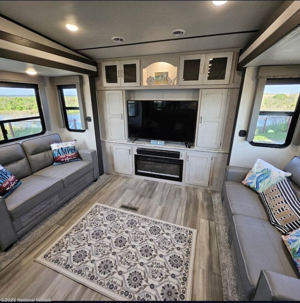 Living Room: The living area features a TV, cable-ready setup, and theatre seating. The RV is also prepped for a TV in the bedroom, and includes an antenna, WiFi booster, and a radio with indoor and outdoor speakers.