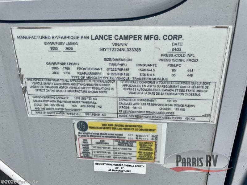 Request More Info on this 2022 Lance Lance Travel Trailers 2285 Offered for sale by Parris RV