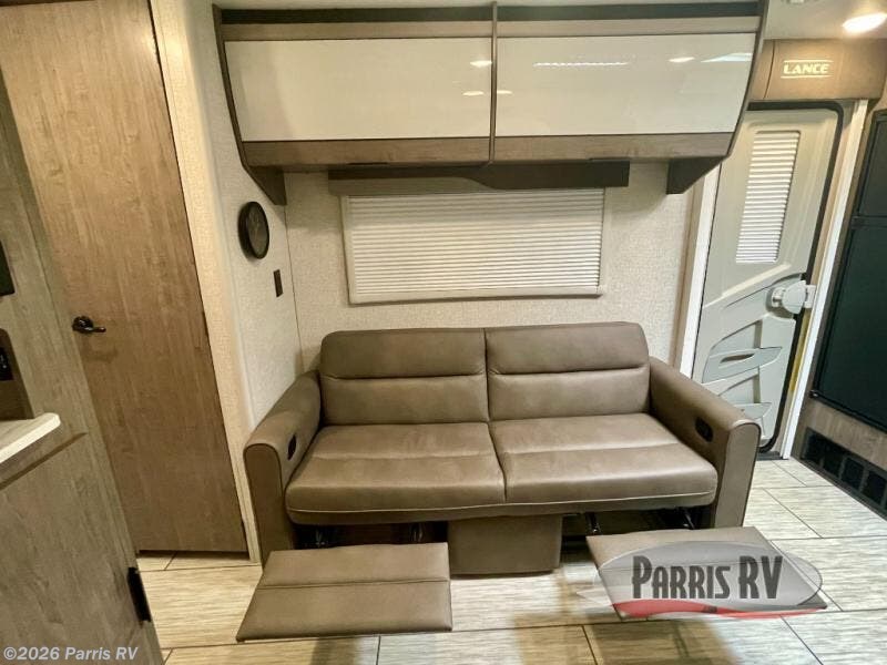 Seize the opportunity for a lifetime of great adventures with this Lance travel trailer! There is a single slide that allows the U-shaped dinette to move out of the walkway, so you can freely get to the front bedroom area from the rear kitchen. If you draw the privacy curtain at the front, you'll be able to section off the queen-size bed into a semi-private bedroom, and if you don't need the extra sleeping space from the 36" x 63" sofa bed, you can add the optional swivel rockers in its place. Use the 32" smart LCD TV for a movie night with the rest of the group, and enjoy the added closet space with bedside wardrobes and a wardrobe across from the bathroom.