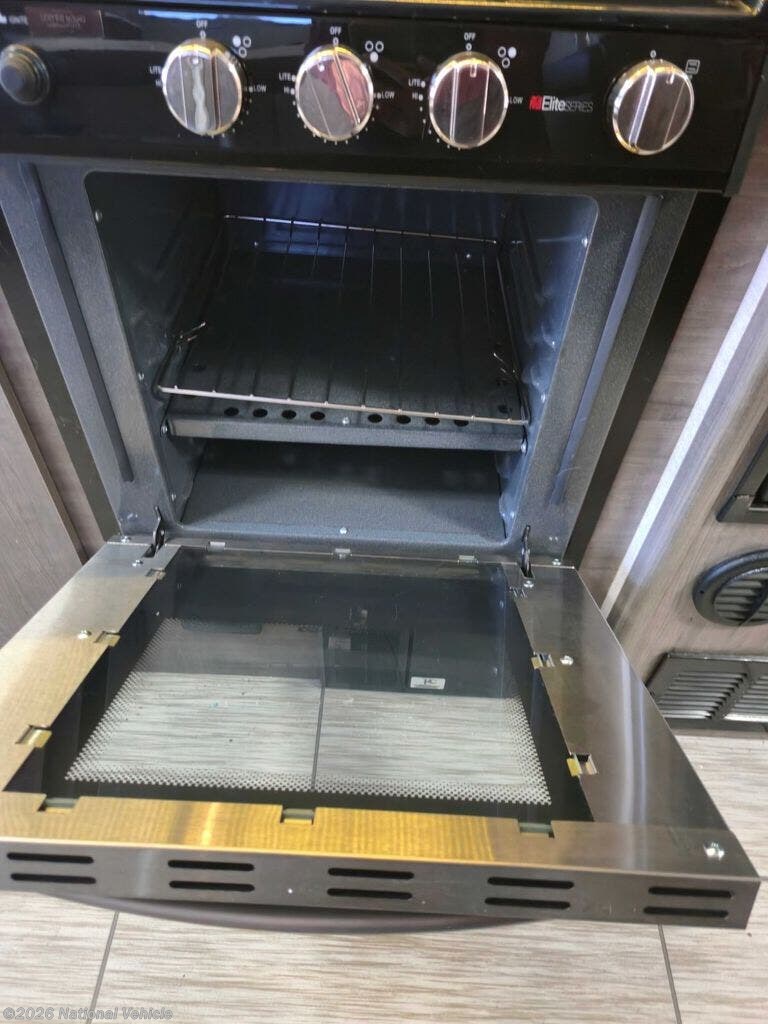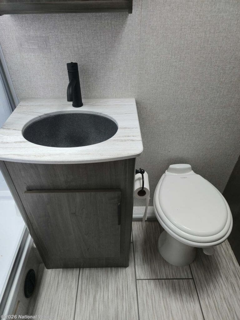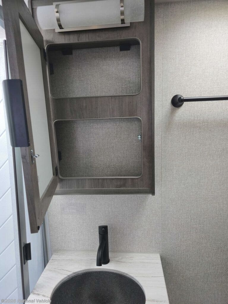 In the rear, a rare full-width bathroom provides a large shower, ample counter space, and abundant storage ? the kind of room you don?t expect in a lightweight trailer.