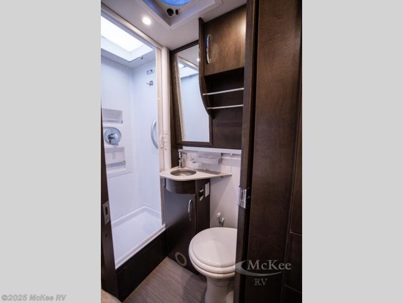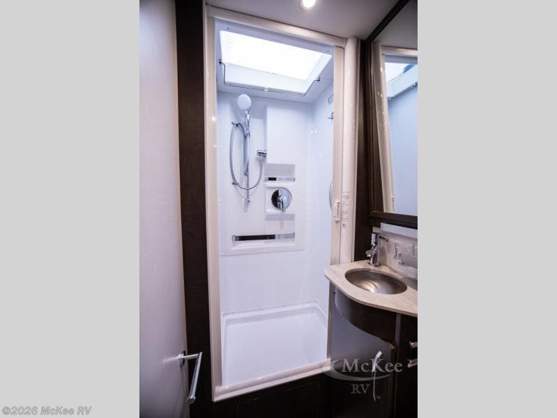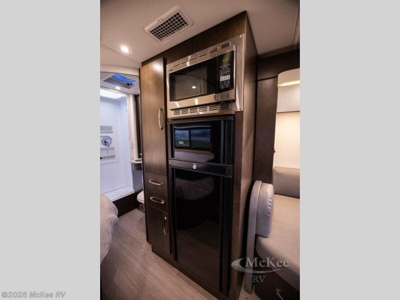 If you are searching for new adventure or the same campground that your friends are at, you will enjoy the drive with this Unity Class B+ diesel motorhome, and you will also enjoy all the kitchen accommodations such as the convection microwave, the Corian solid-surface countertops, and the large pull-out pantry when making your famous dessert for everyone. You will find sleeping space on the full-size bed and even on the dinette once folded down for the evening. The driver and passenger chairs swivel to provide more seating, and you will surely appreciate having a retractable self-cleaning shower screen, shower skylight, and flip-down towel bar in your own bathroom to get cleaned up before bedtime.