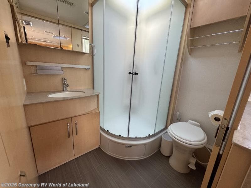 With a large residential-style bathroom in this Unity Class B+ diesel motorhome, you will enjoy every moment you spend cleaning up in the radius shower, and the skylight above will deliver more height and extra sunshine to illuminate the entire space. During the day you can host friends and family with the swivel cab chairs and standard Leisure Lounge, or you can choose to add the optional Leisure Lounge Plus. Once the party has ended, you can rest peacefully for the evening after you've turned down the Murphy bed. The next morning you might decide to make breakfast on the cooktop or in the convection microwave and serve from the countertop extension or on the Corian solid-surface countertops.
