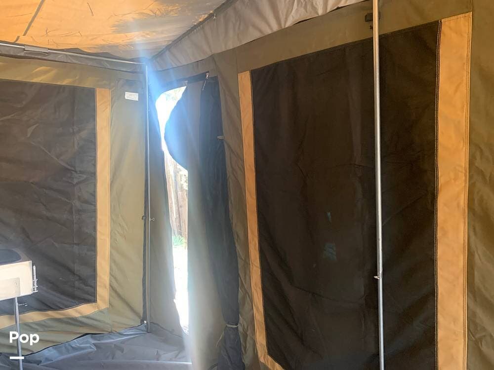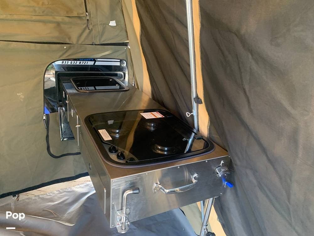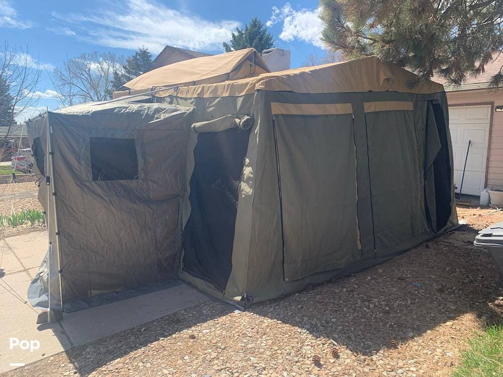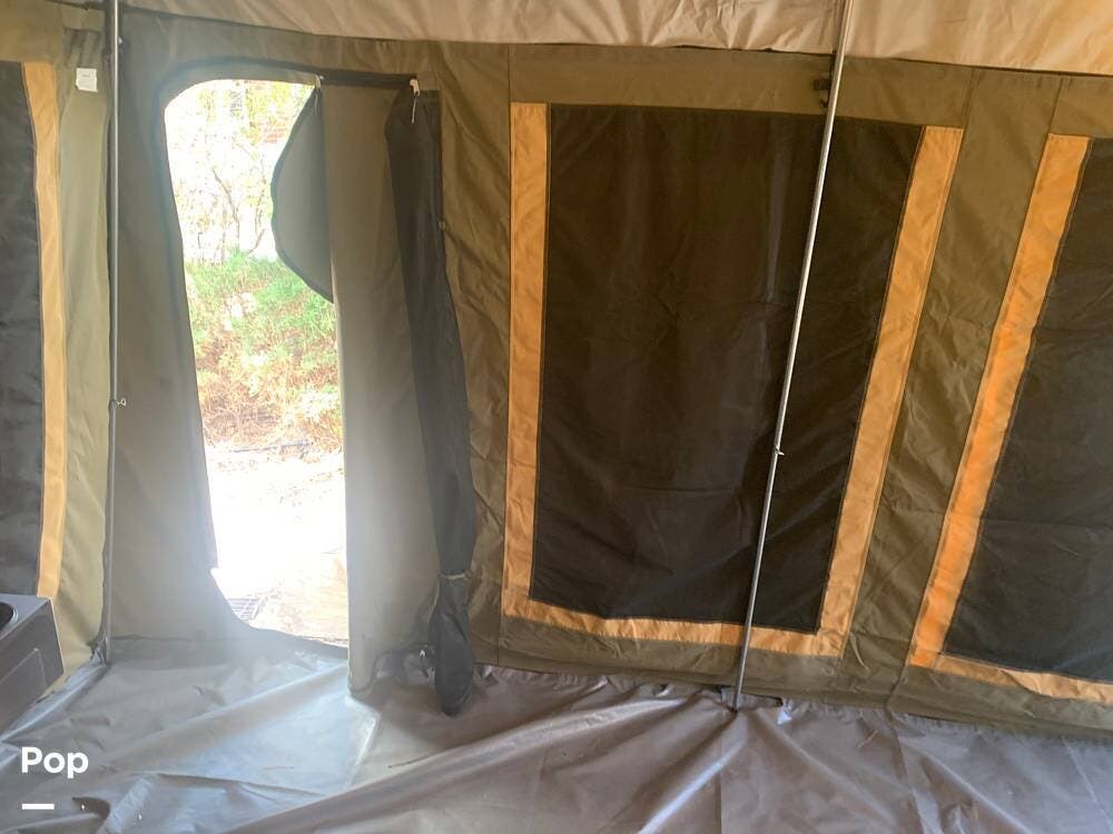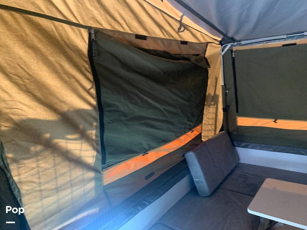 Outfitted with a large tent enclosure, this folding camper expands its footprint, offering a private bathroom area where you can add a portable toilet and shower setup.