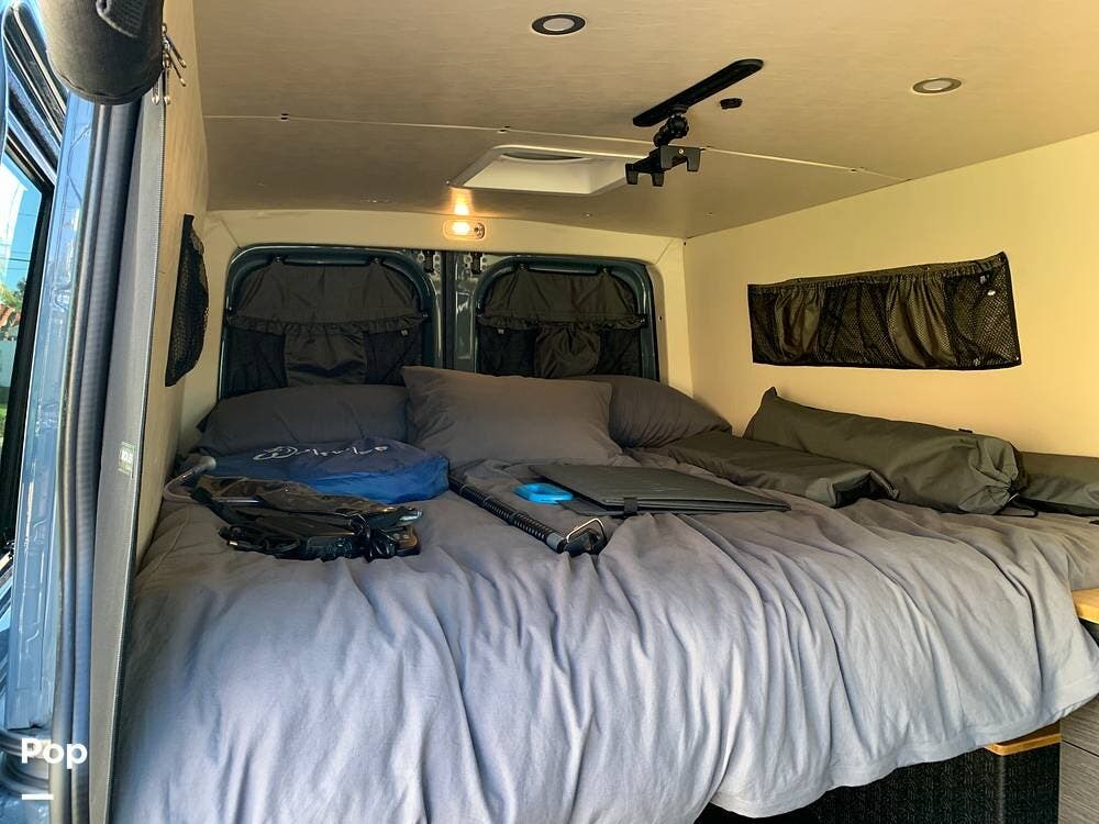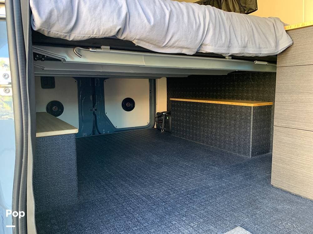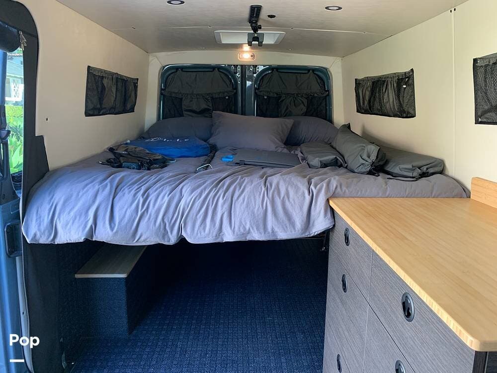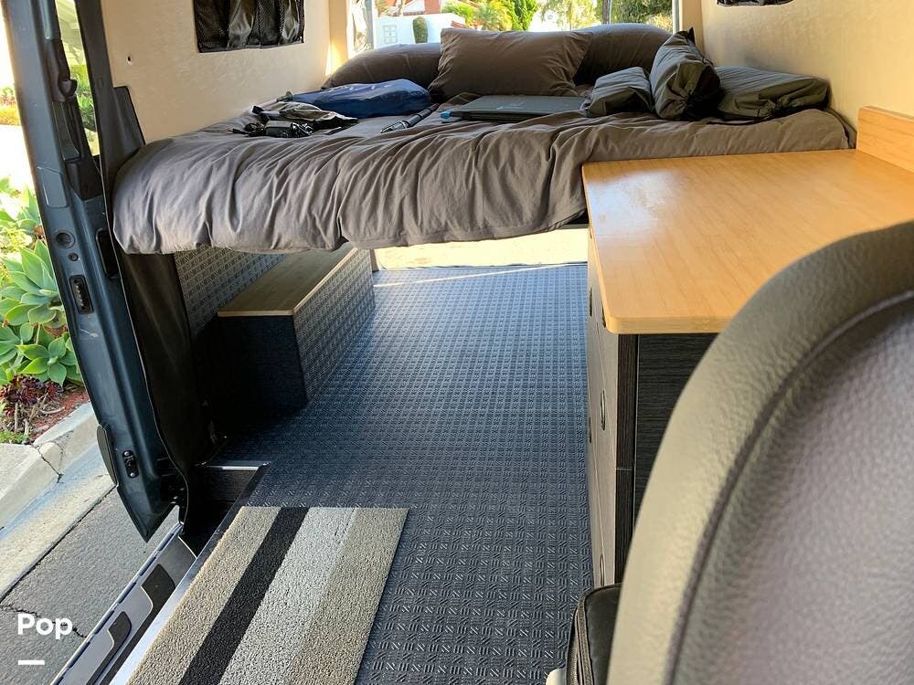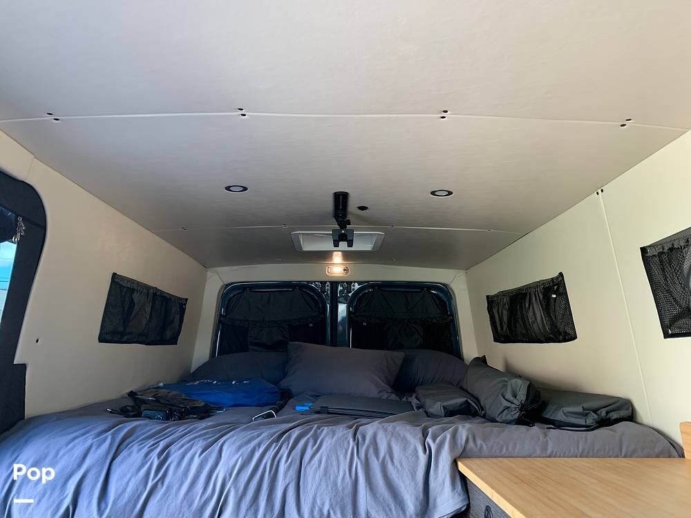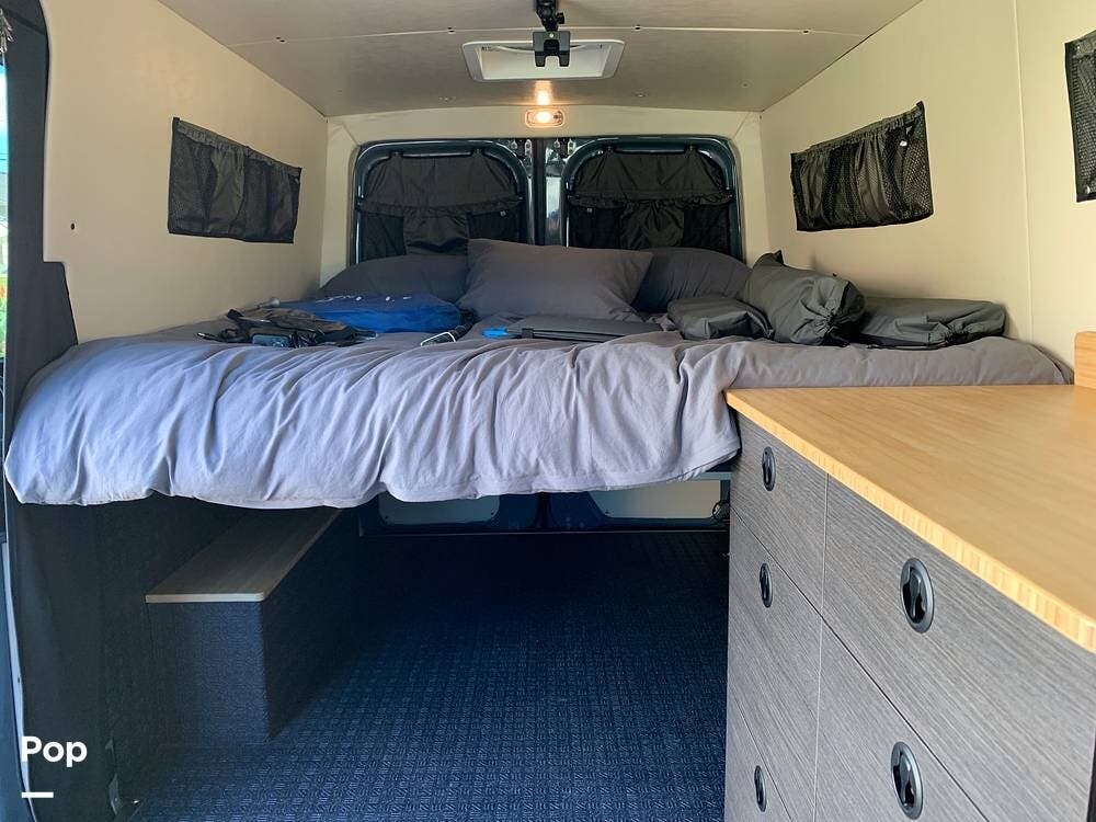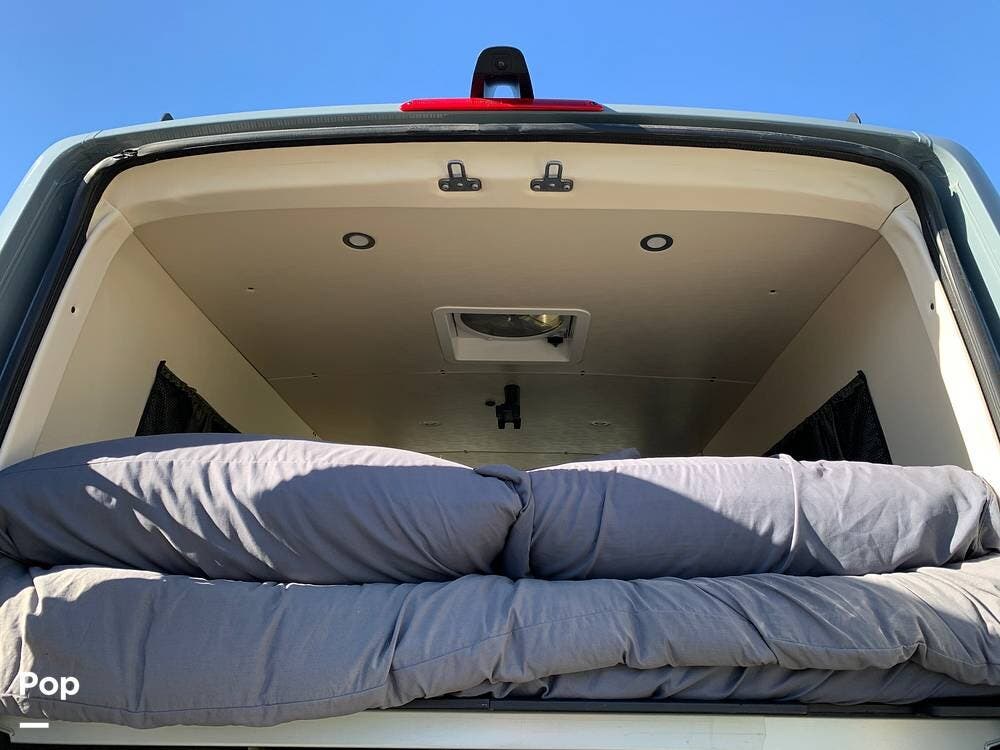 This Sprinter sleeps 2, With a Custom Aluminum Bed Platform and a comfortable upgraded memory foam mattress.