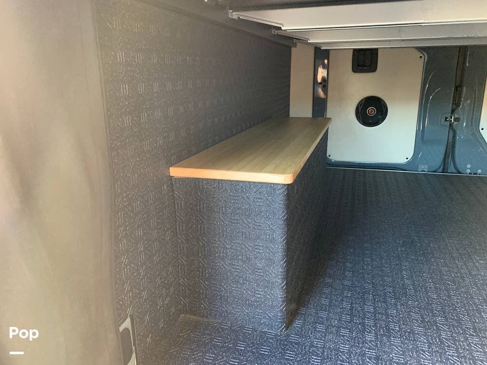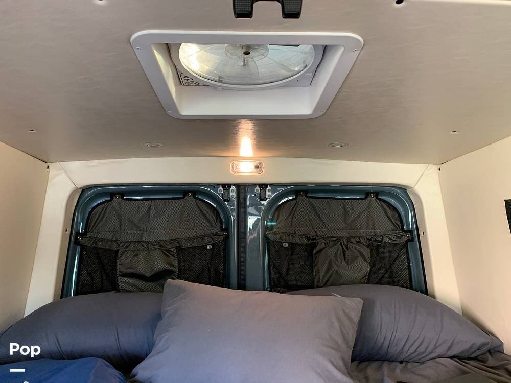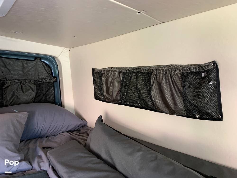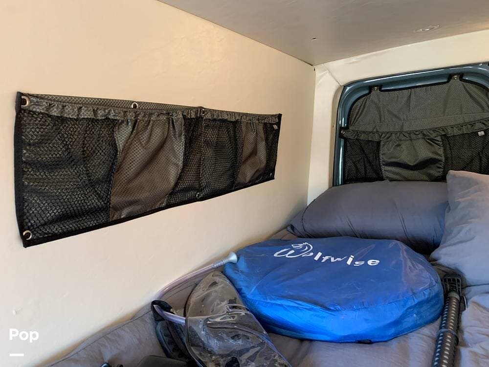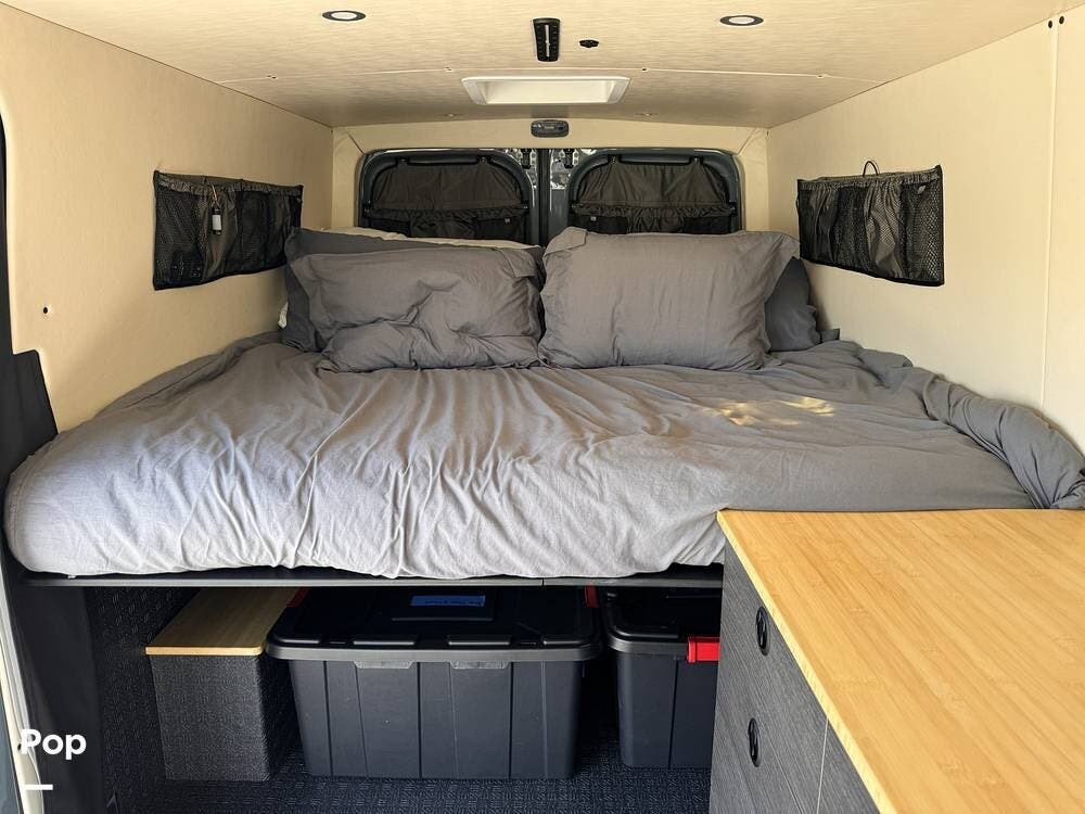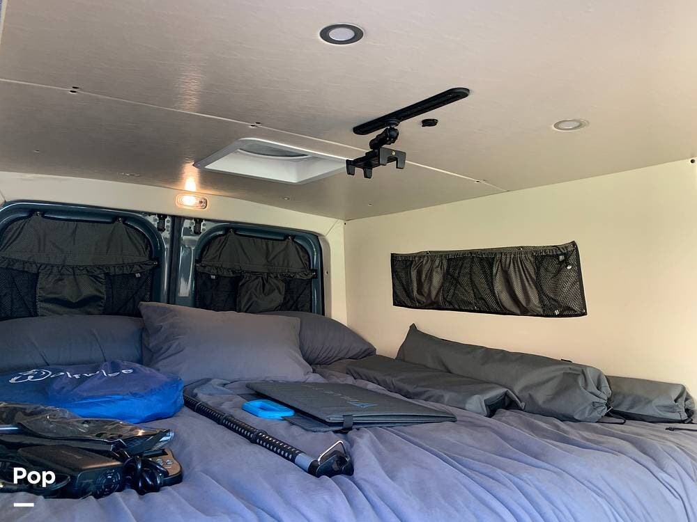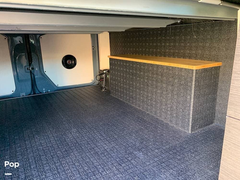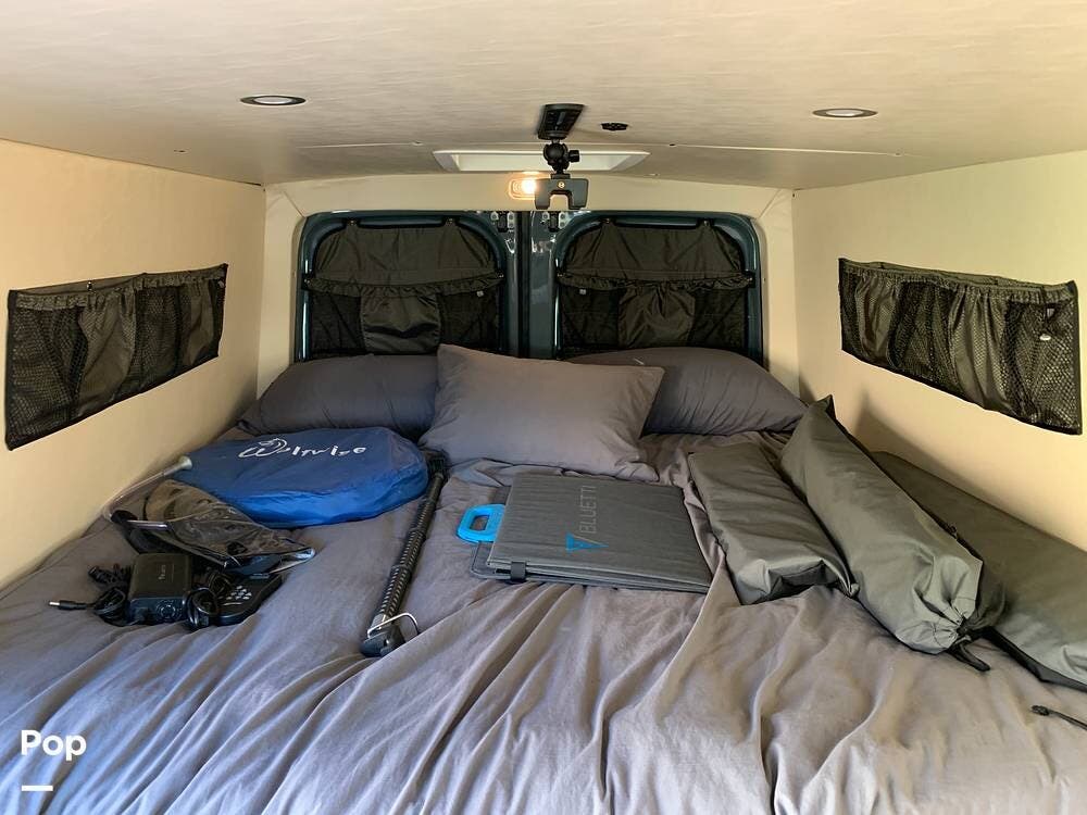 This Sprinter sleeps 2, With a Custom Aluminum Bed Platform and a comfortable upgraded memory foam mattress.