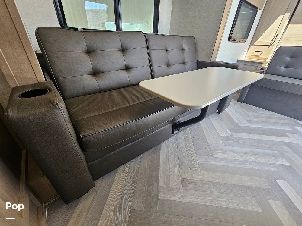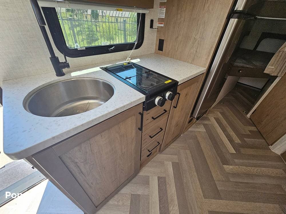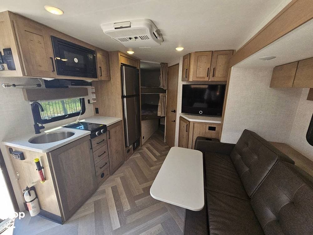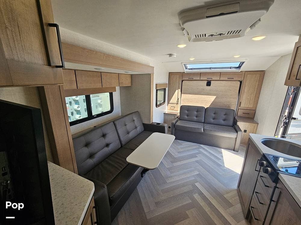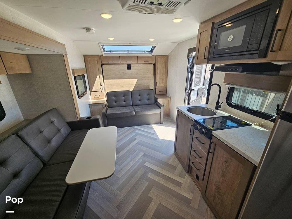 The slide-out dinette expands the living area while offering excellent storage underneath. The well-appointed kitchen features a 12V fridge, stainless steel sink, two-burner cooktop, and convection microwave, making meal prep easy wherever you go.