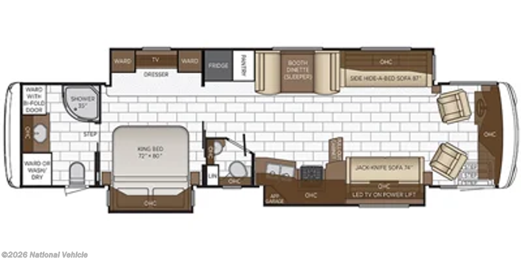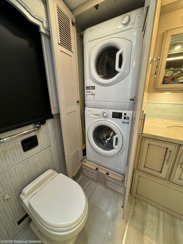 Enjoy a home on wheels with this motorhome! The full rear bathroom has a 35" radius shower to take a relaxing, hot shower each morning, a wardrobe with a bi-fold door to store your towels, and a second wardrobe that has a washer and dryer for clean clothes throughout your entire trip. The half bathroom is conveniently next to the fully-appointed kitchen which has a pull-out cabinet to keep your items out of the way. At night you can choose to either relax on the 87" hide-a-bed sofa or the 74" jackknife sofa while a movie plays on the 50" Samsung LED 4K TV on a power lift or head to the booth dinette to play a card game or two!