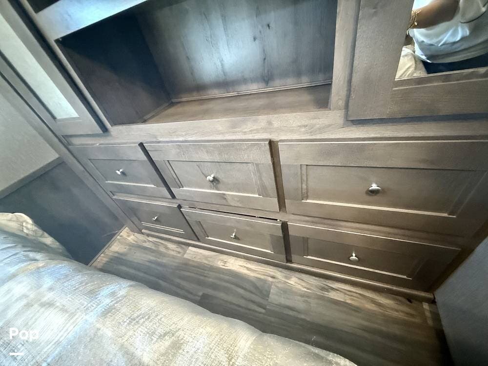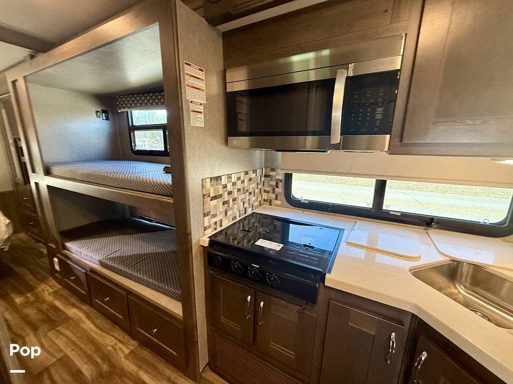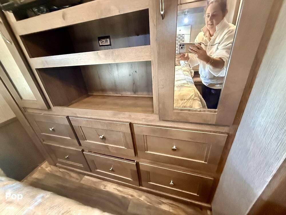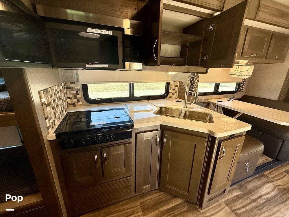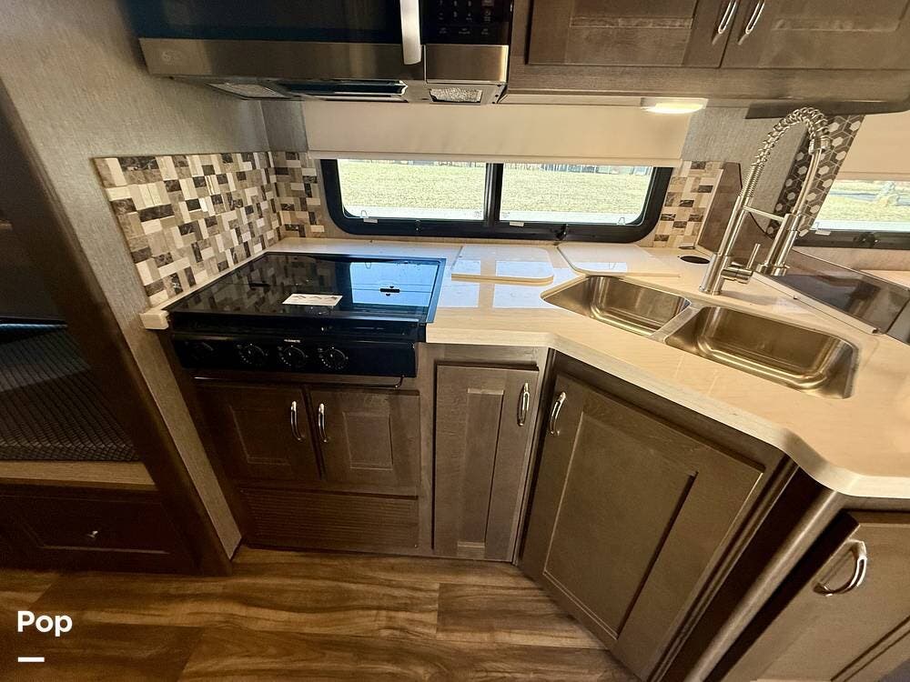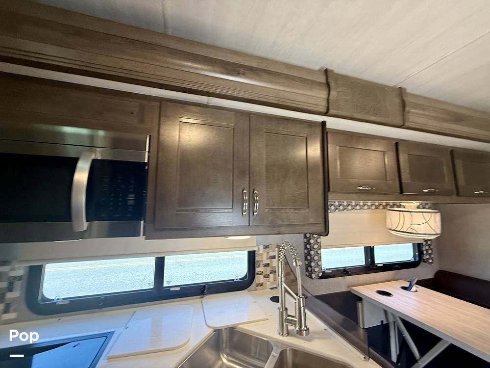 Inside, the 35R floorplan is designed for both comfort and functionality. The spacious living area features opposing slide-outs, solid surface countertops, residential-style cabinetry, and premium finishes throughout.