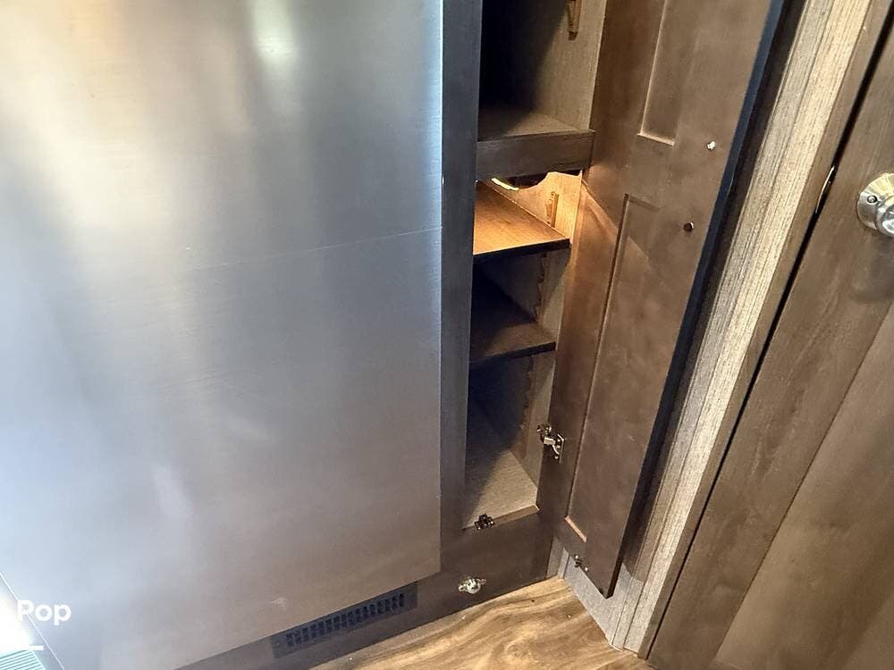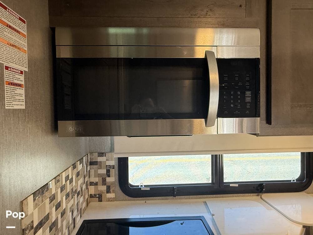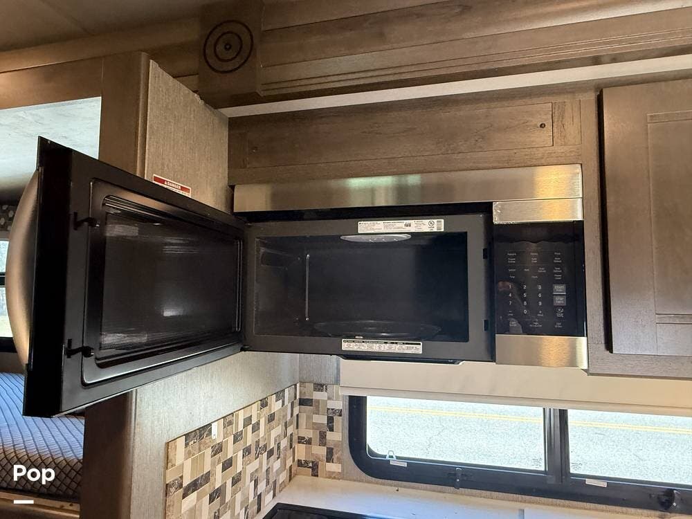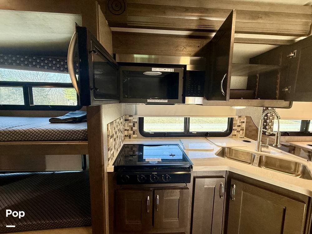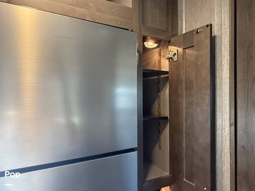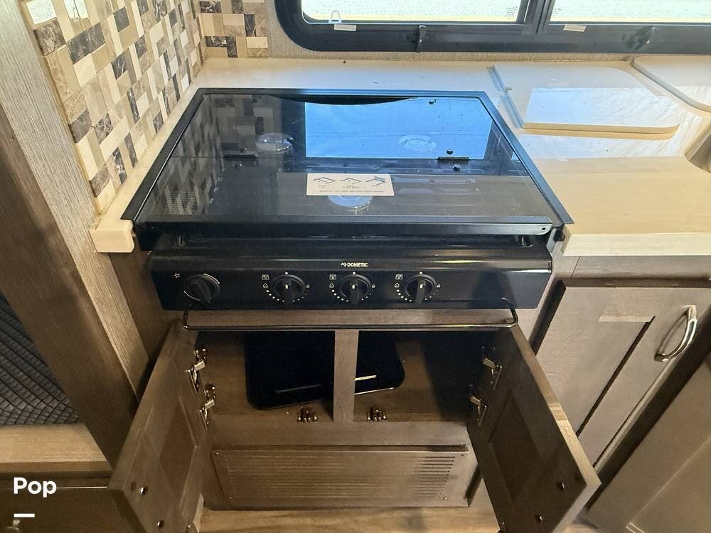 The fully equipped kitchen offers a residential refrigerator, convection microwave, three-burner cooktop, and generous pantry storage for extended trips.
