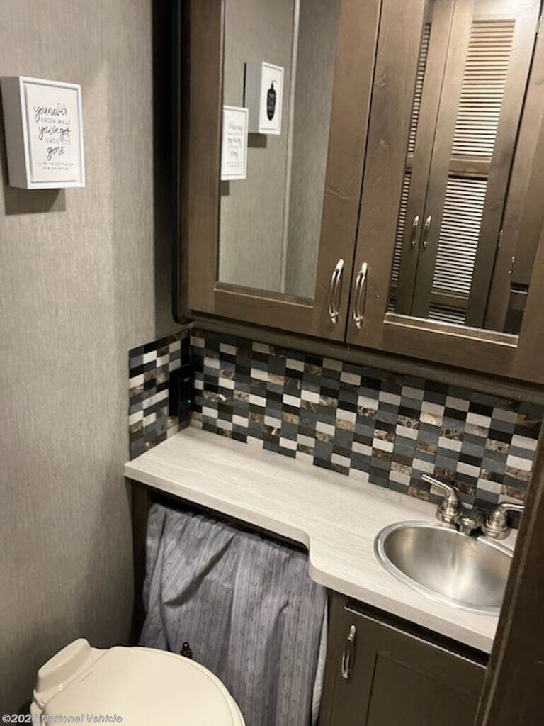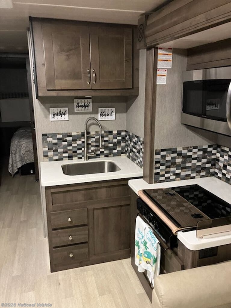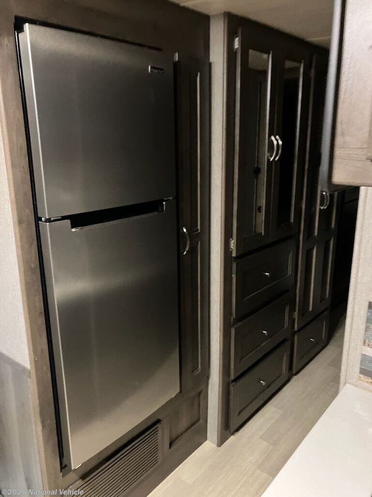 The well-appointed kitchen impresses with quality appliances, generous counter space, and smart storage - a perfect setup for meal prep on the go or preparing dinner at the campsite. Dine comfortably at the dinette or relax in the cozy lounge area with panoramic views.