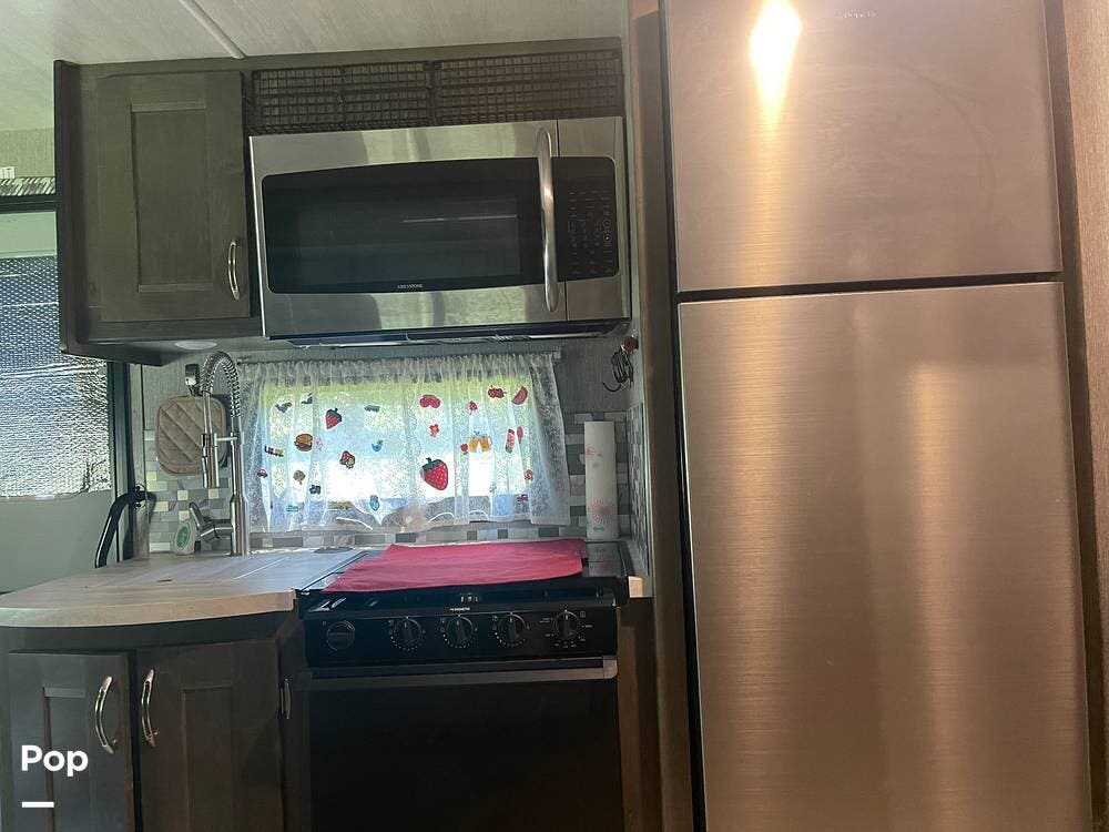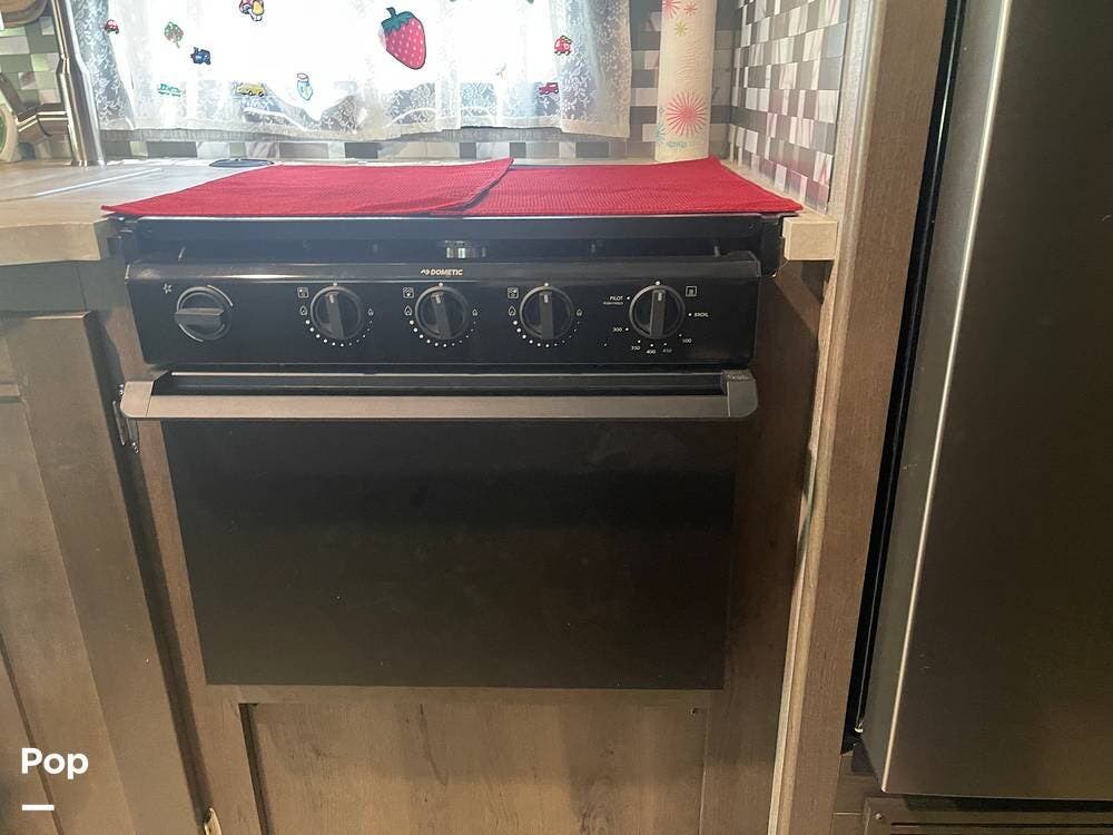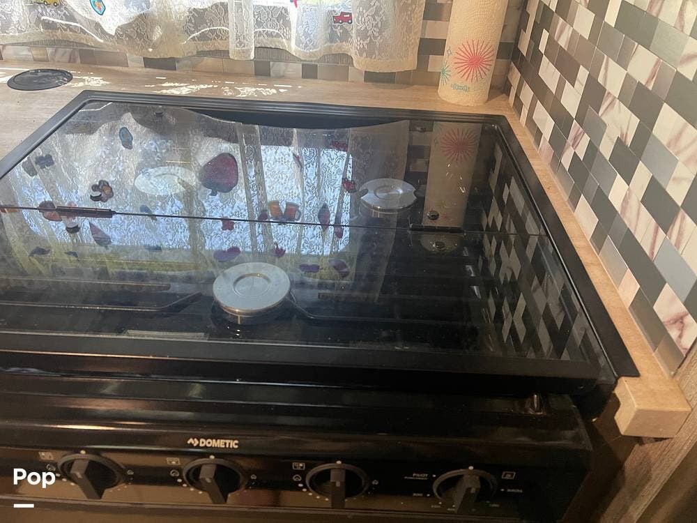 The kitchen is fully equipped with a refrigerator, a microwave, a three-burner cooktop with an oven, and a deep sink, making it easy to prepare meals on the road.