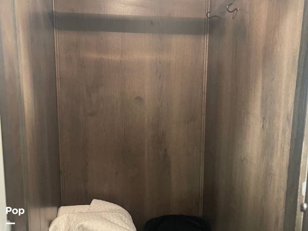 The bedroom has a queen-size bed with overhead storage and wardrobe closets. The full bath includes a stand-up shower, vanity, and ample storage, providing all the essentials for extended trips.