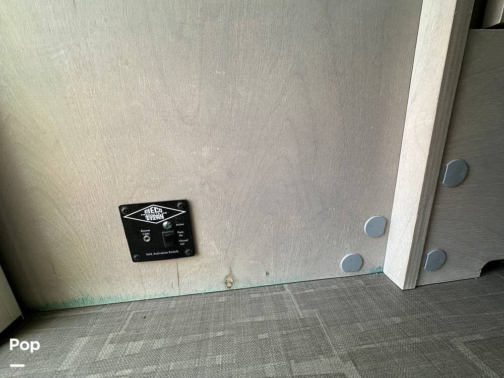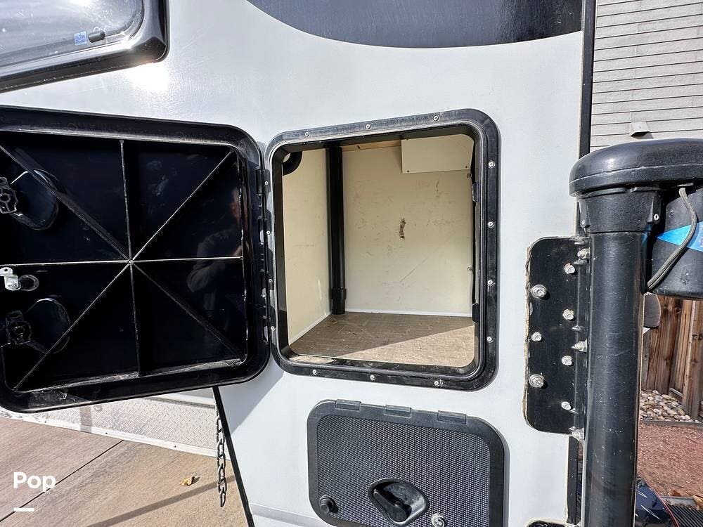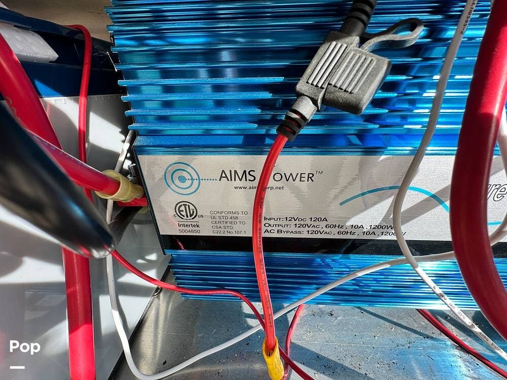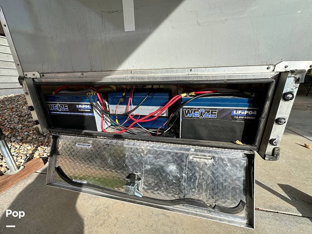 The exterior features are many and include electric jacks for easy on & off, upgraded 100AH Lithium batteries with heaters, outdoor shower, roof access ladder, and a battery isolator.