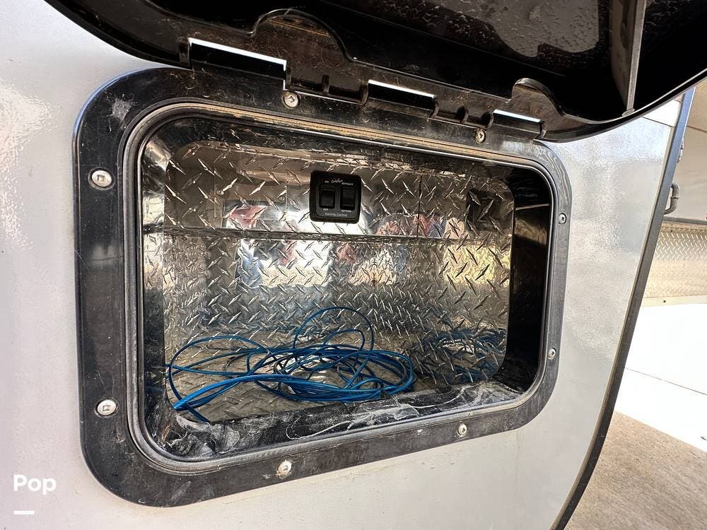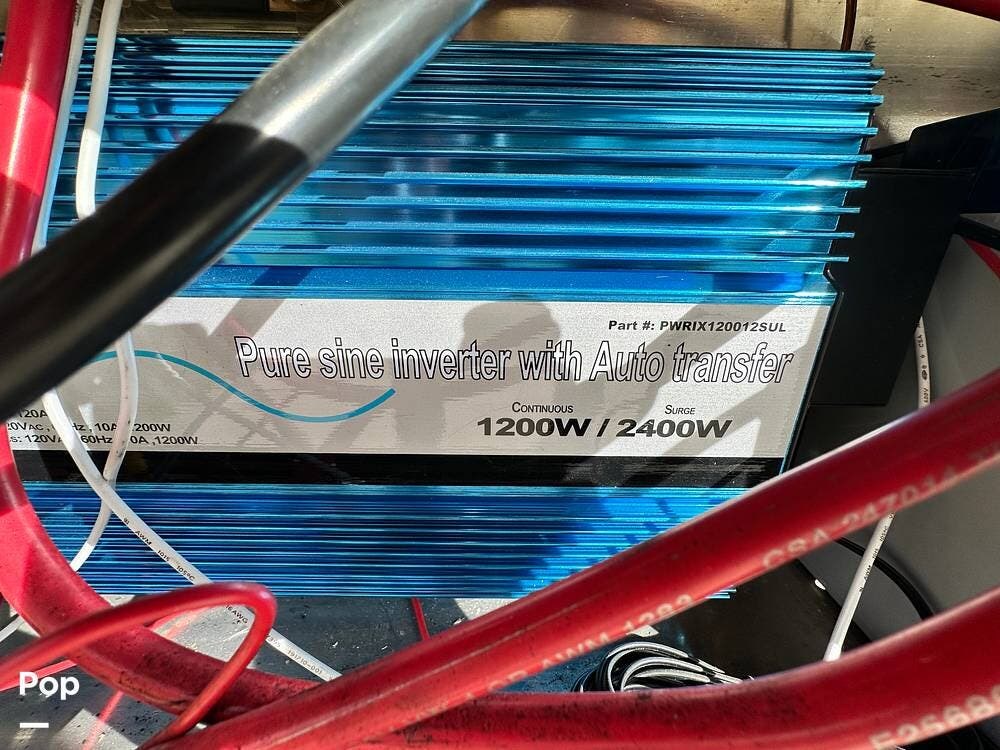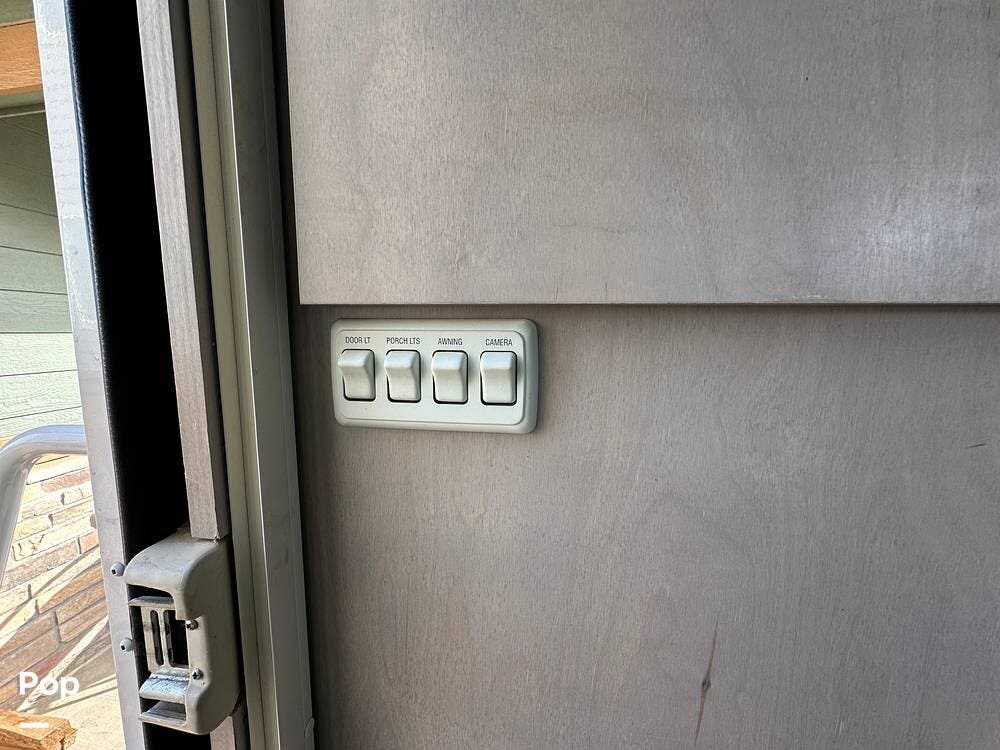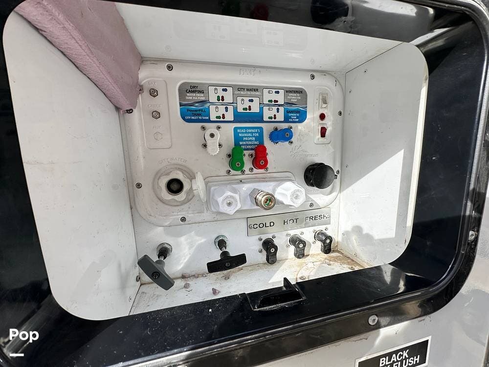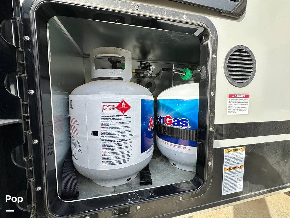 The exterior features are many and include electric jacks for easy on & off, upgraded 100AH Lithium batteries with heaters, outdoor shower, roof access ladder, and a battery isolator.
