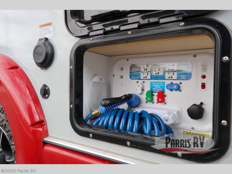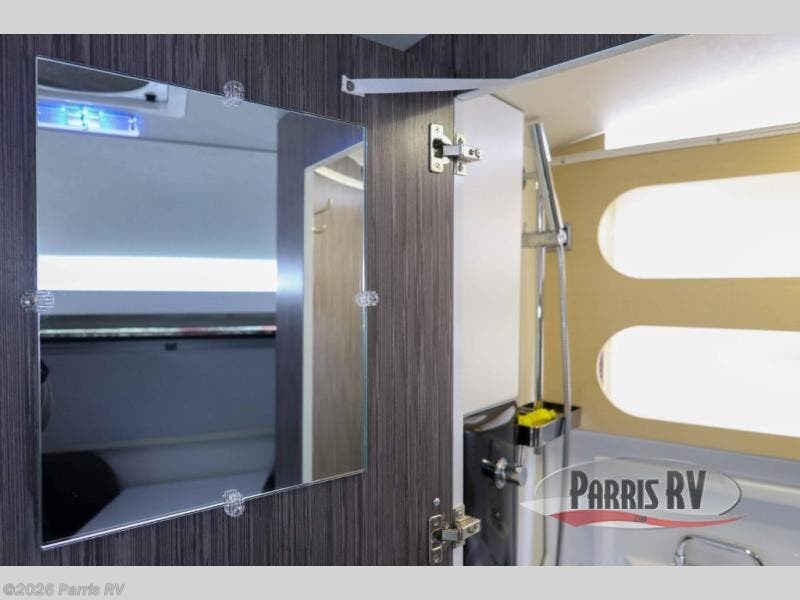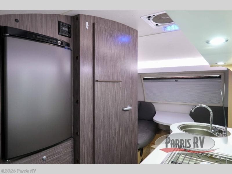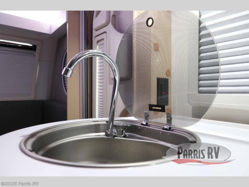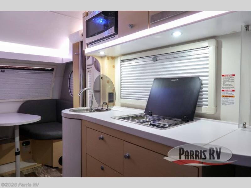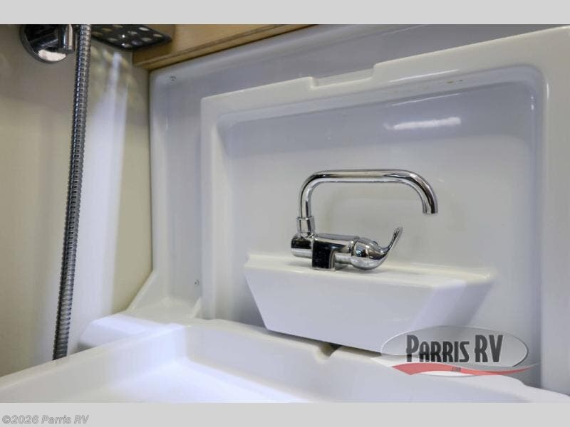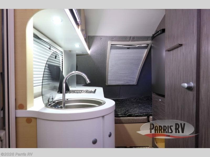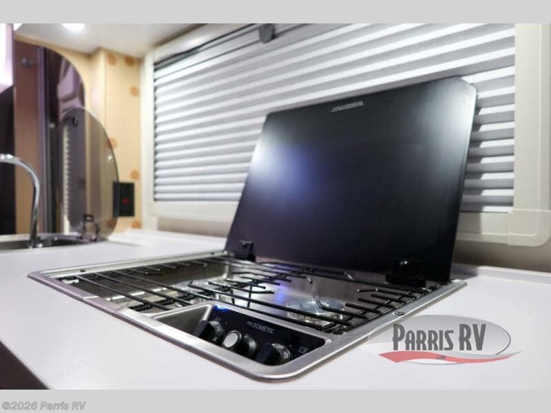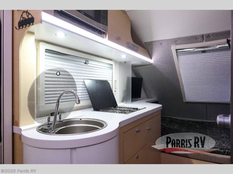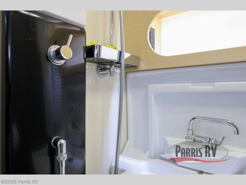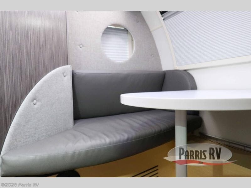 This teardrop trailer offers sleeping space for three with two sleeping areas; one up front and one in the rear. The dinette allows you to eat and relax during the day, and at night this space becomes sleeping space for one. The queen-size sleeping area is located on the opposite side with the wet bath in between for convenience for all. The galley kitchen will give the cook a place to make warm meals and store leftovers in the 2-Way 2.3 cu. ft. fridge or you can choose the 2-Way 4.6 cu. ft. fridge option. Everyone can watch the 24" TV through the Bluetooth media center before bedtime or in the morning as you all plan your next activity. And the Alde central heat and Alde FLOW instant hot water system as well as the central AC system will keep you comfortable where ever you setup. Please note that if you choose the 3-Way fridge option and/or the Boondock option, some specifications will change.