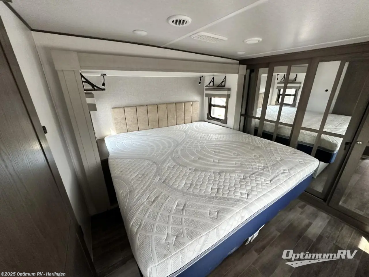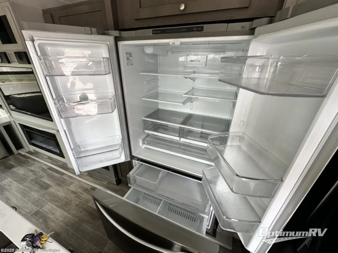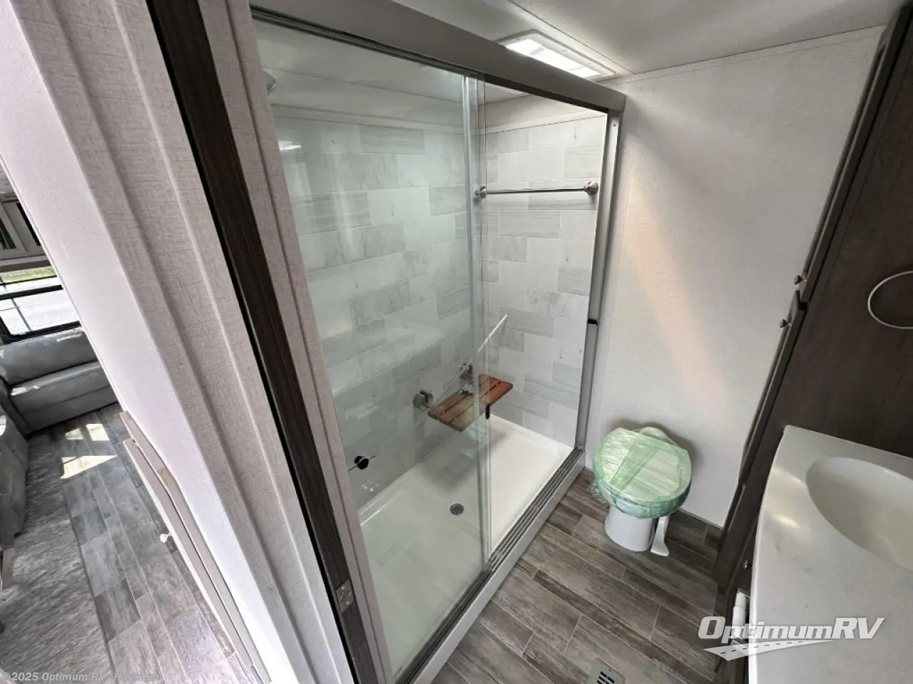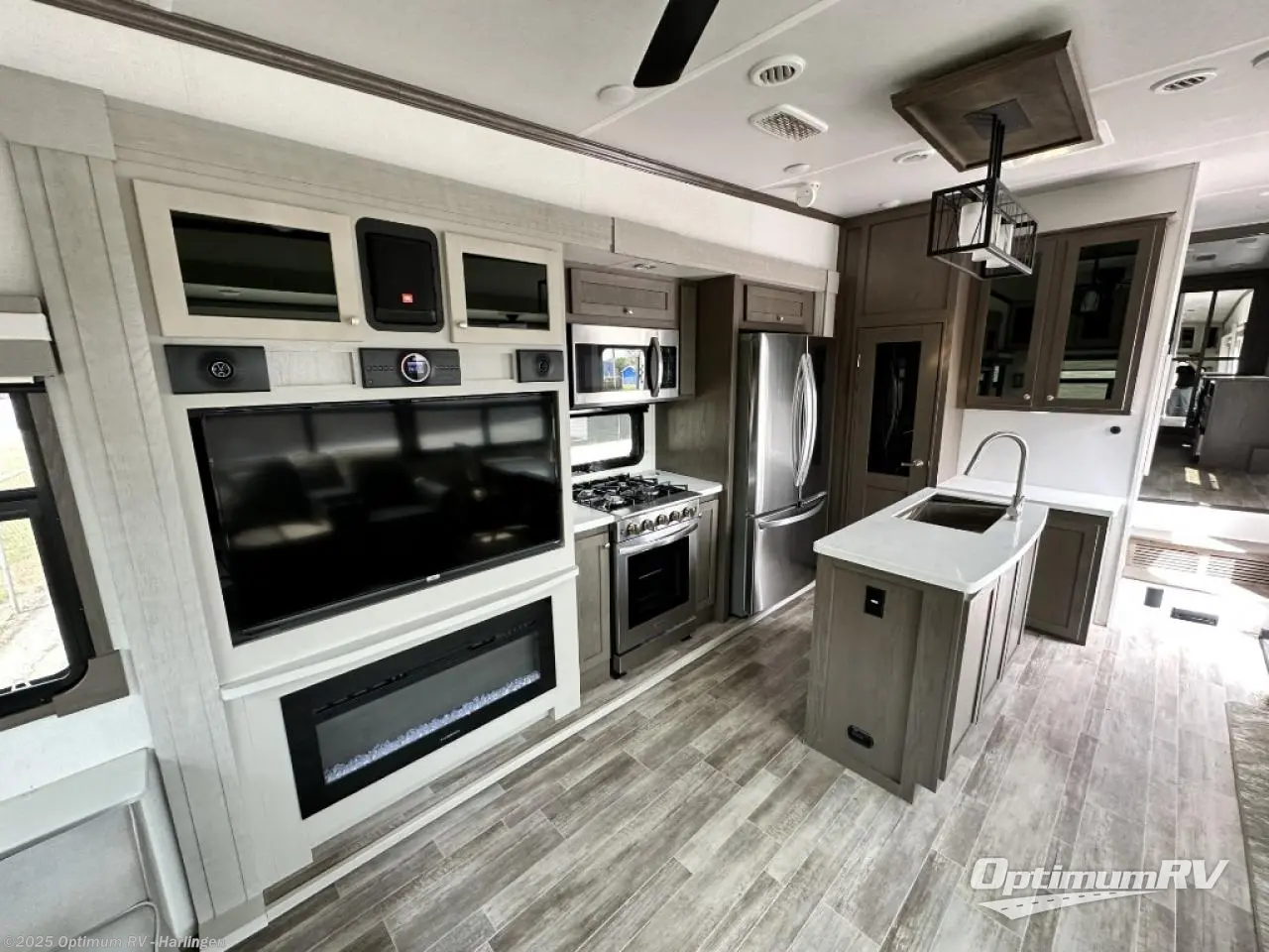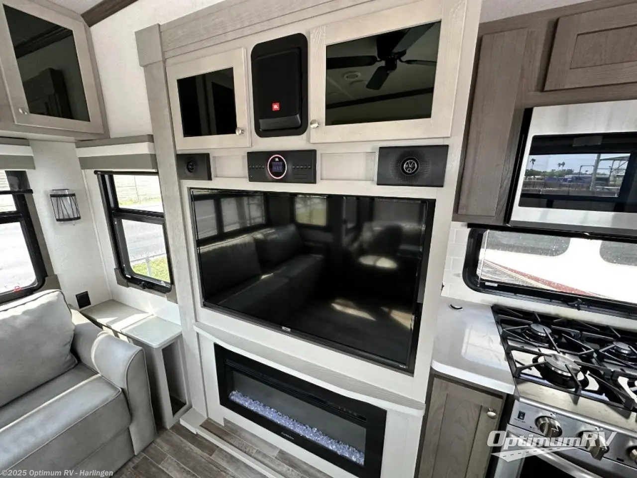 Experience a true home away from home in this fifth wheel! With a rear living area featuring an entertainment center with a fireplace and 50" TV with JBL sound system, a 88" split tri-fold sofa, and a 65" power theater seating, you can be sure to have a relaxing evening. The kitchen island makes meal prepping easier and the four burner Insignia cooktop lets you cook more at one time. Once your meal is ready, head to the table and chairs to enjoy it there then maybe play a card game or two. The full bathroom not only has a large signature spa shower with a a teak flip up seat, a linen area, and a closet, but also a dual sink vanity for two to get ready at once. You will feel right at home in the front private bedroom with the king bed slide across from the dresser with a 32" TV, and a front wardrobe with mirrored sliding doors which is also prepped to add an optional washer and dryer!
