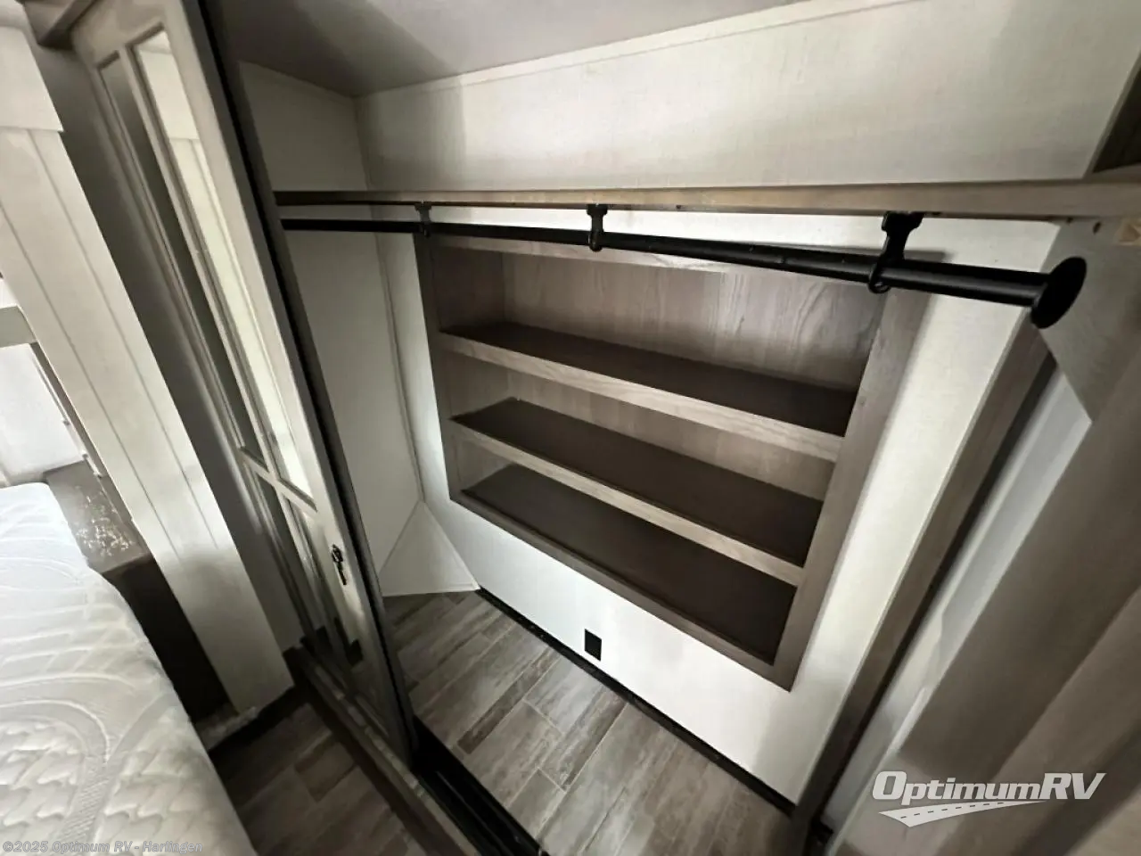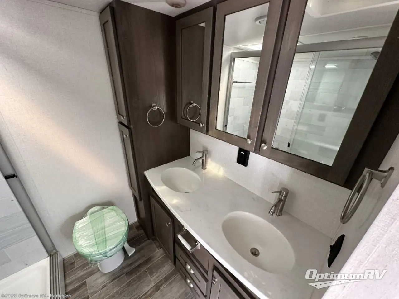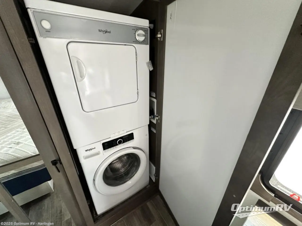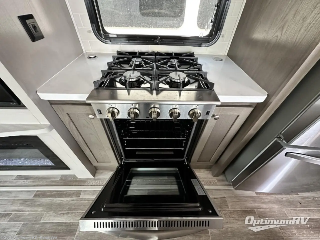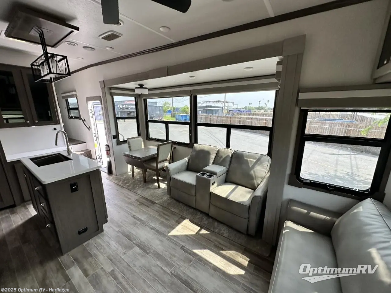 Experience a true home away from home in this fifth wheel! With a rear living area featuring an entertainment center with a fireplace and 50" TV with JBL sound system, a 88" split tri-fold sofa, and a 65" power theater seating, you can be sure to have a relaxing evening. The kitchen island makes meal prepping easier and the four burner Insignia cooktop lets you cook more at one time. Once your meal is ready, head to the table and chairs to enjoy it there then maybe play a card game or two. The full bathroom not only has a large signature spa shower with a a teak flip up seat, a linen area, and a closet, but also a dual sink vanity for two to get ready at once. You will feel right at home in the front private bedroom with the king bed slide across from the dresser with a 32" TV, and a front wardrobe with mirrored sliding doors which is also prepped to add an optional washer and dryer!