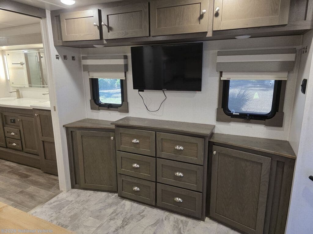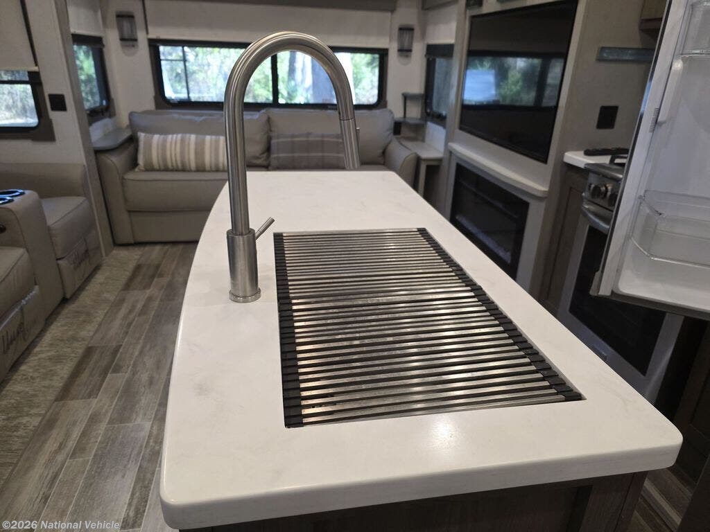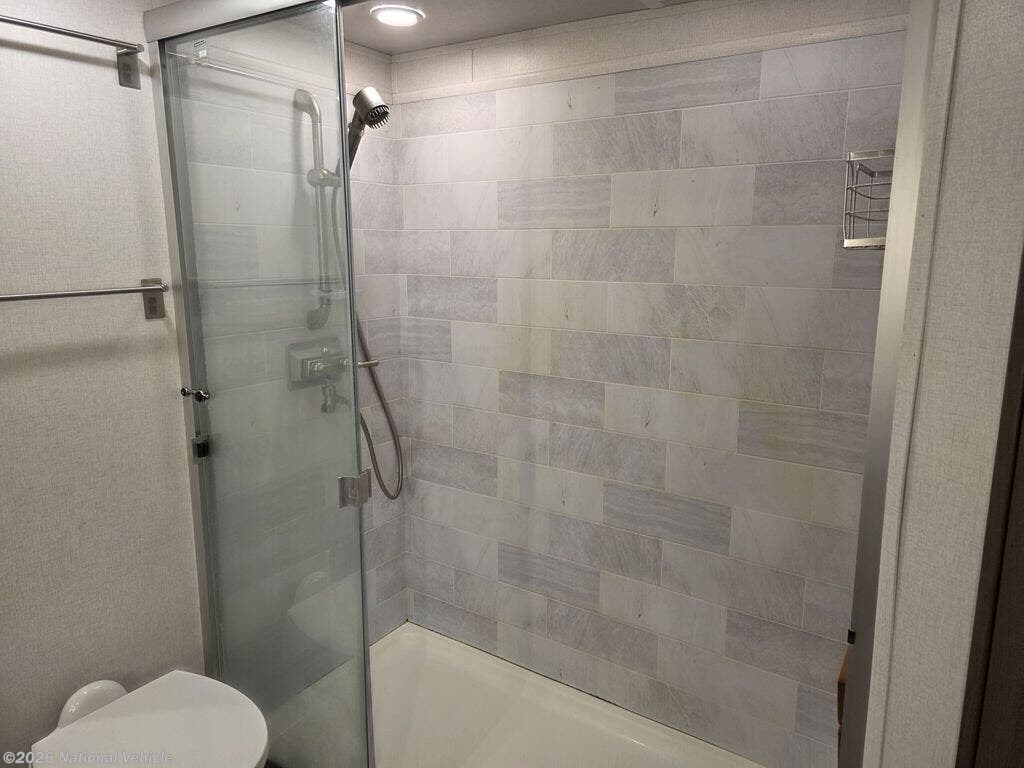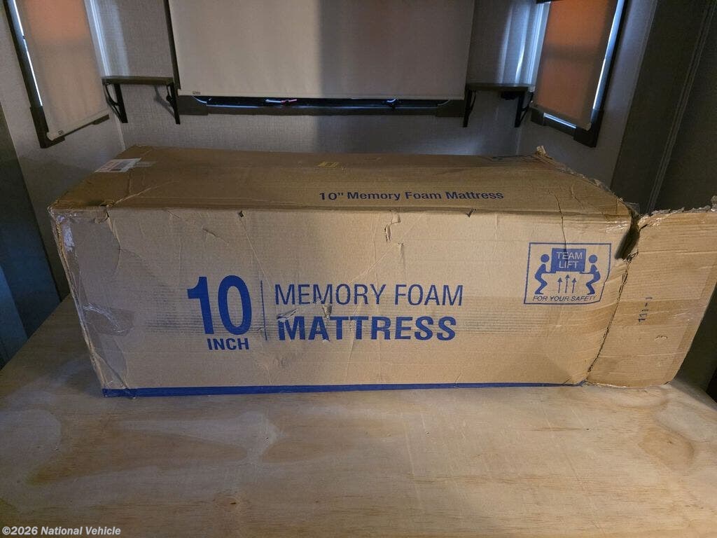 The spacious front bath layout features a double vanity and generous storage, while the heart of the coach showcases a large kitchen island and an oversized walk-in pantry complete with a built-in wine cooler?perfect for entertaining or long-term stays. For the new owner, a brand-new king-size mattress remains factory-wrapped, ready for first use.