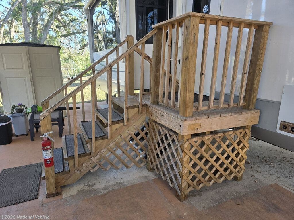 All slide-outs are equipped with toppers, enhancing durability and comfort. The unit is wired for a backup camera, includes two full propane tanks, and comes complete with a tongue jack stand and custom wood stair platform for easy entry. This coach has been non-smoking, reflecting the outstanding care it has received.