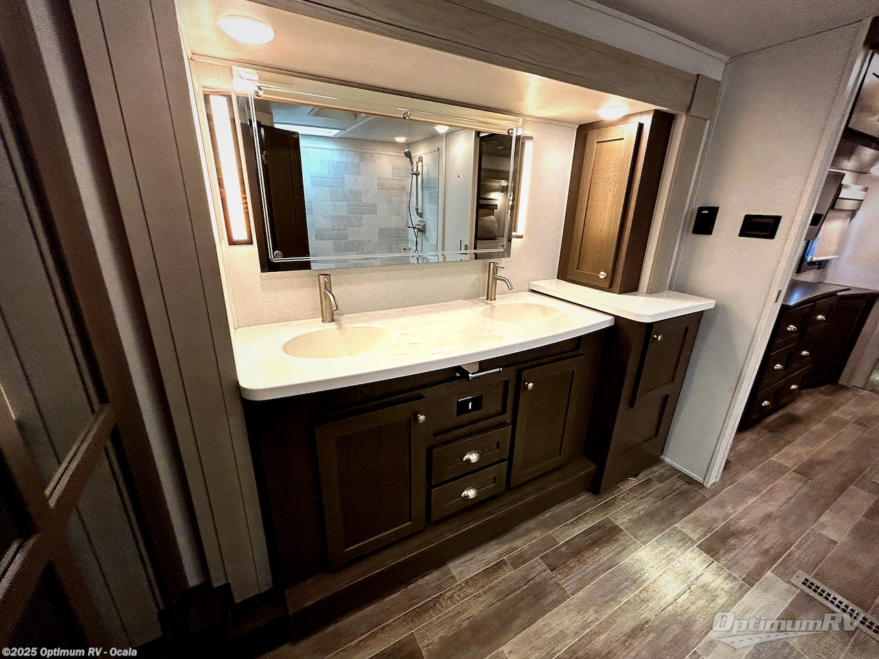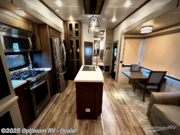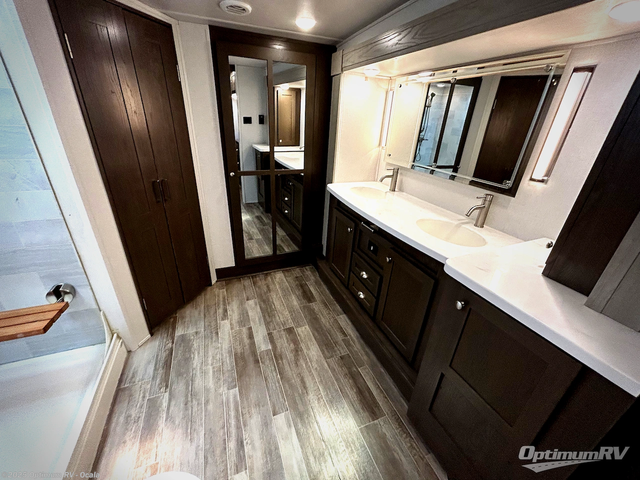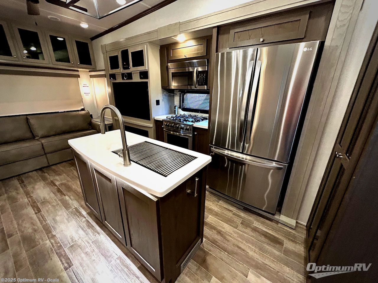 Everyone will stay clean with a bath and a half in this fifth wheel! The kitchen has a pantry big enough for everyone's favorite snacks, a four burner Insignia cooktop, and a kitchen island to prepare your best meals. You can have game night indoors at the table and chairs or set up a table and chairs underneath the two power awnings. The rear living area offers a comfortable place to watch the big game too with a 88" split tri-fold sofa and 65" power theater seating directly across from the entertainment center which has overhead cabinets with hidden storage, an electric fireplace, and a 50" TV with JBL sound system. Two can get ready at once in the front bathroom with the dual sink vanity and you can even add an optional washer and dryer!