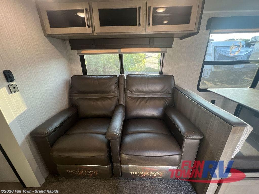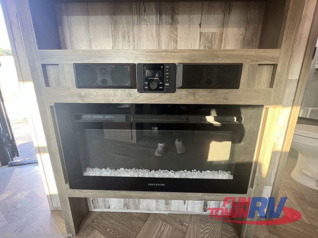 Walk into this travel trailer with one of the dual entry doors for a great camping trip! One entrance enters directly into the rear private bedroom which has a queen bed slide, a walk-in closet that is prepped for an optional washer and dryer, a wardrobe, and even an entrance into the dual entry bathroom. Grab a snack from the walk-in pantry then relax on the sofa while you watch a movie with the entertainment center or play a game at the booth dinette. The front kitchen has everything you will need to prepare your best home cooked meals including lots of countertop space, and you could even add an optional exterior micro kitchen with griddle for dinner outdoors!