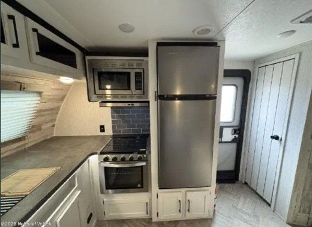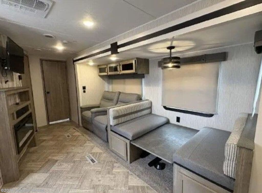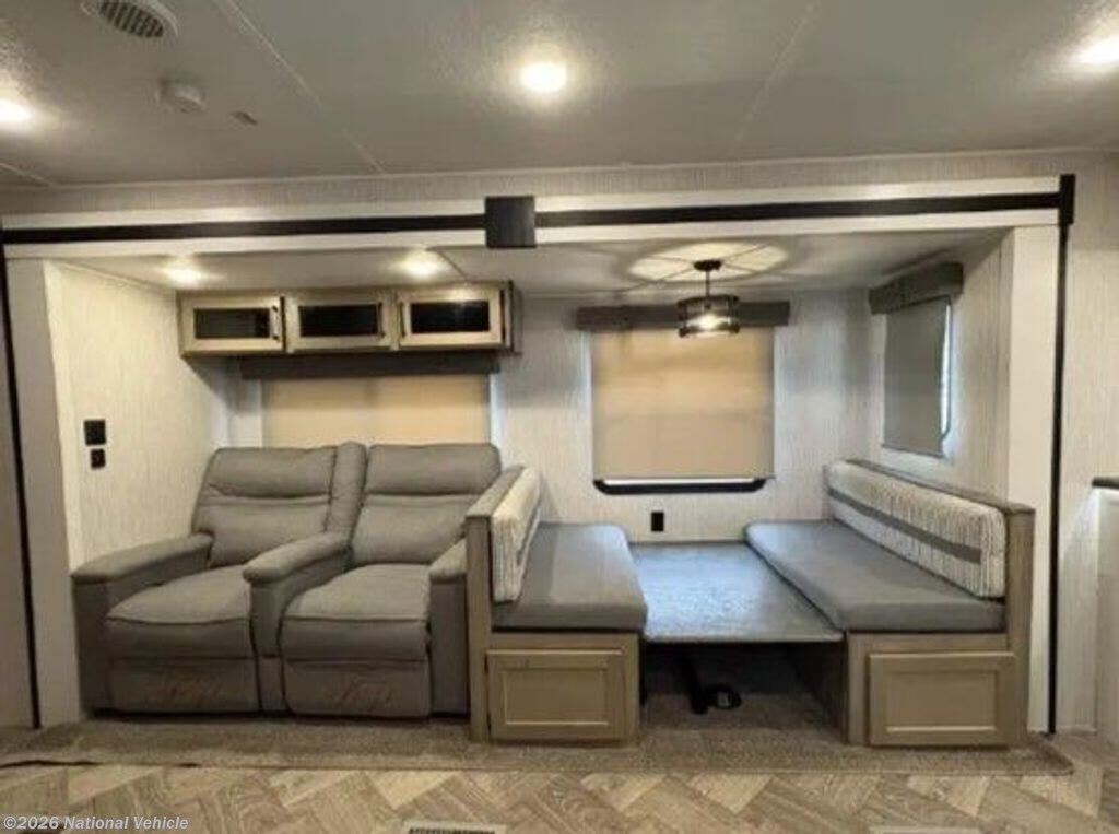 One of the standout features of the 26FKDS is its expansive front kitchen, offering an abundance of countertop space, a full-size refrigerator, 3-burner range with oven, microwave, and generous cabinetry-making it perfect for real-world cooking and entertaining. The layout flows seamlessly into the main living area, where a large slide houses the dinette and theater seating, creating a bright, open space with plenty of seating and room to relax.
