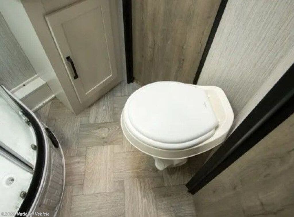 The private rear bedroom provides a comfortable retreat with a walk-around queen bed, full wardrobe storage, and overhead cabinetry. The centrally located bathroom includes a spacious shower, vanity, and linen storage, offering both convenience and functionality for extended stays. With sleeping capacity for up to six, this trailer is versatile enough to accommodate guests while still feeling roomy and comfortable.