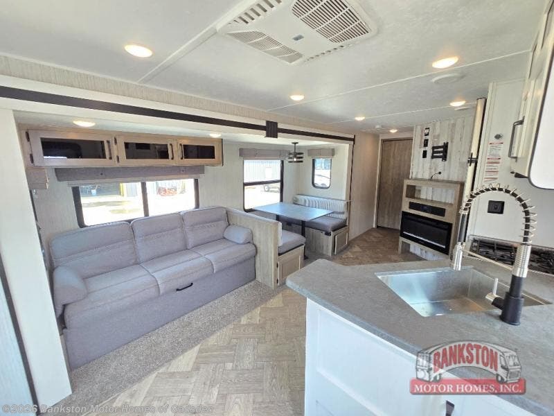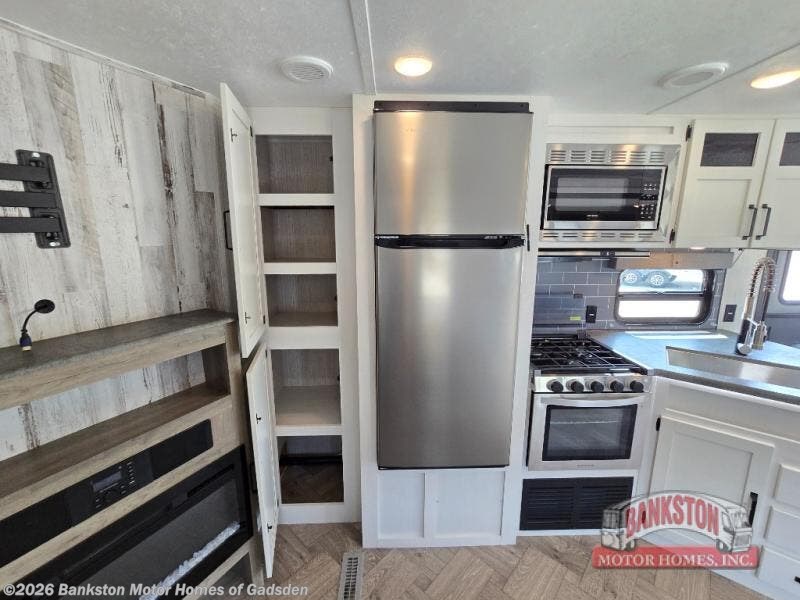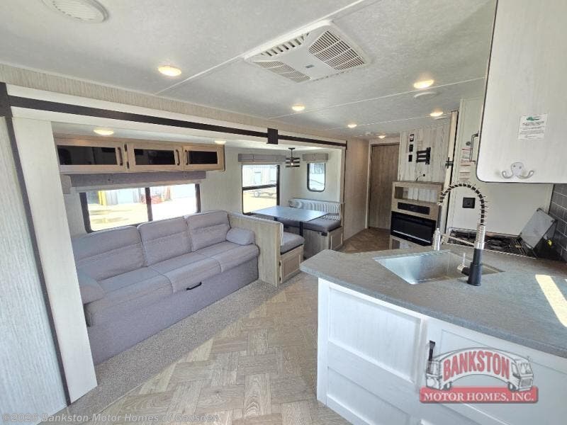Comfort and convenience is found all throughout this travel trailer! The set of rear recliners have an end table in between to set your cup of coffee as you read the newspaper, and the sofa is a great place to take an afternoon nap. After you have prepared your best home cooked meal with the three burner cooktop and 11 cu. ft. stainless steel refrigerator, you can head to the booth dinette then play a card game or two. The full bathroom has a 34" x 34" radius shower to freshen up in before heading to the front private bedroom to enjoy a good night's rest on the queen bed which has shirt closets and nightstands on either side of it.