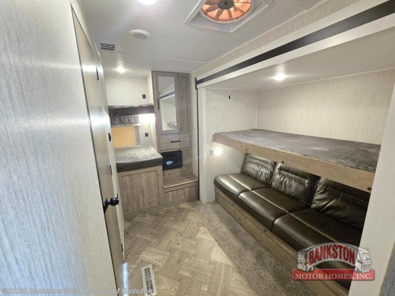 With two full bathrooms, it's a clean decision to take this travel trailer on your next family vacation! Start each morning feeling recharged after sleeping on the queen bed in the front private bedroom or in the rear private bunkhouse with an angled top bunk above a 32" x 69" double bunk bed and a 32" x 69" bunk above a 68" sofa slide. The bunkhouse also has a full bathroom with a 24" x 40" tub and one of the dual entry doors to the unit. You can relax on the sofa while enjoying the entertainment center and eat your meals prepared with the kitchen island at the booth dinette. There is even an optional exterior vertical slide kitchen with flip-out grill/griddle combo to grill up some juicy burgers in the great outdoors!