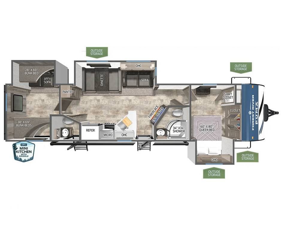 One of the biggest highlights of the 32BHQS floorplan is the bunk area, which adds valuable sleeping space and flexibility for kids, friends, or visiting family. Combined with the private front bedroom and convertible sleeping spaces in the main living area, this Puma offers the sleeping capacity buyers often look for in a true family camper.