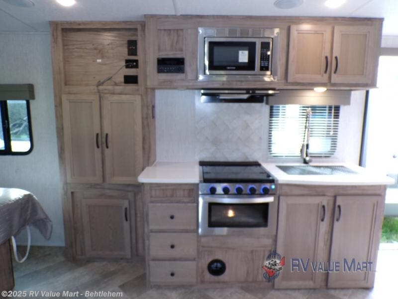 This trailer allows you to camp in comfort at your favorite RV sites thanks to the slide out sofa sleeper with a table to dine at, and the front queen bed to sleep on with dual wardrobes to store your clothing! The galley kitchen includes amenities such as a microwave, a glass top flush mount range, plus an 11 cu. ft. refrigerator. And there is a pantry for your goodies. The corner full bathroom offers a space-savings radius shower and linen storage, and there is an entry closet to keep the main area tidy.