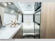 You will experience a comfortable ride in this Plateau Class B diesel motorhome with memory foam sofa cushions. The wet bath comes fully equipped with a medicine cabinet with a mirror, a Corian countertop, a towel rack, plus a handheld showerhead. The exterior shower also has a handheld showerhead to make rinsing off the mud even easier. All of the seating throughout is covered in Ultraleather fabric, including the swiveling captain's chairs. With the generous amount of available storage in the full-size wardrobe, you can easily reach any of your hang-up clothes!