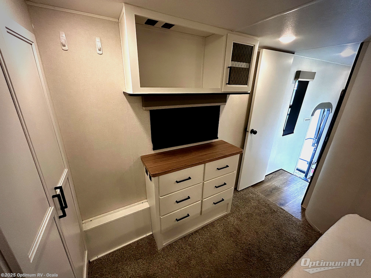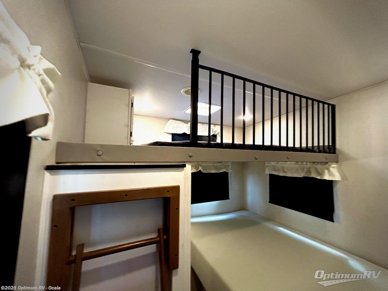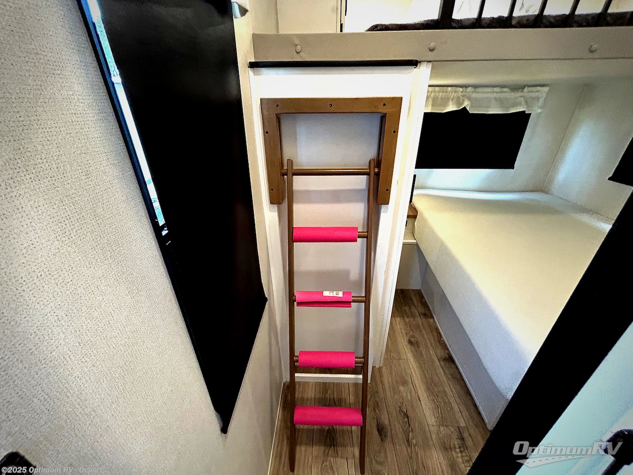 Friends and family will love to tag along to the campground in this dual entry, bath and a half, two-bedroom fifth wheel! A king bed comes standard in the front bedroom, along with a front wardrobe and a dresser for clothes storage. Your guests can take the rear bedroom with a 54" x 75" bed with a loft bed above, plus a half bath with its own exterior entry door. Meet in the central living area on the theater seating and across from the LED TV, or head outdoors to relax under the 19' awning. The chef will love the interior kitchen since it has a kitchen island with a butcher block top, but they may decide to cook outdoors on the outside kitchen if they're frying bacon or fish!