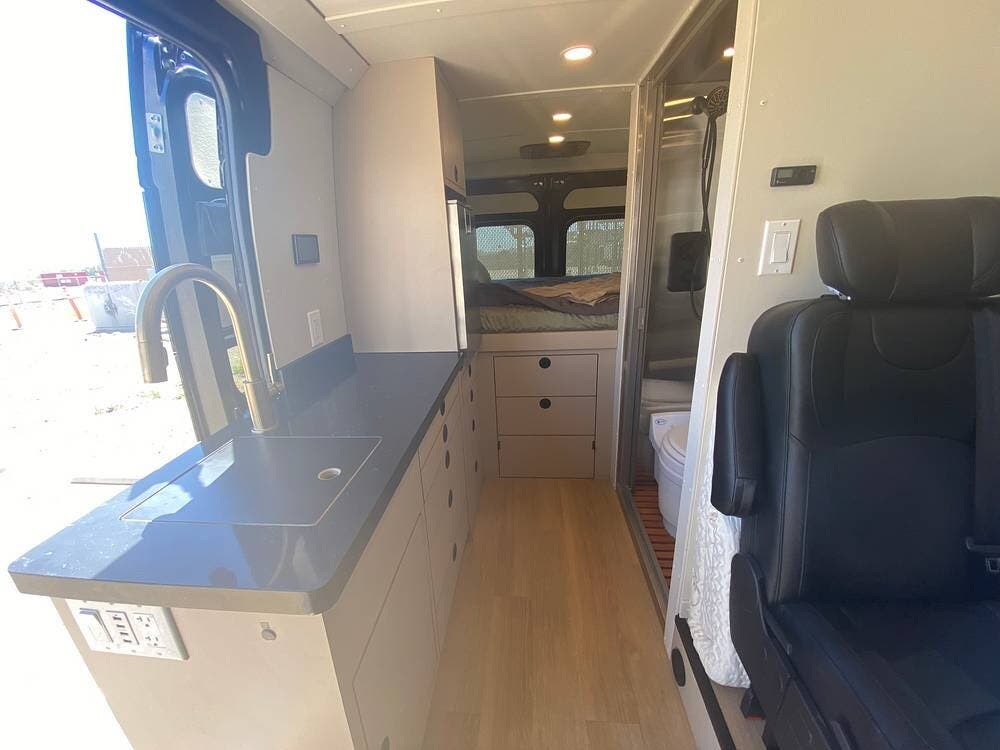 This ProMaster features a stove, toilet, shower sink, microwave, convertible, full-size bed, and room for 3 passengers.